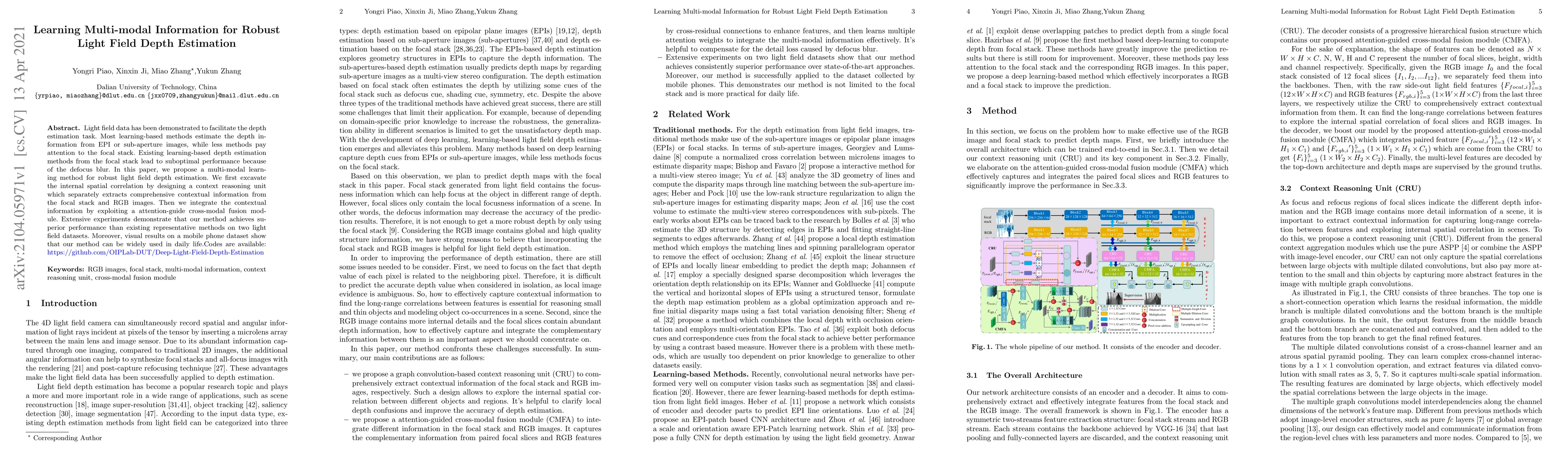 A new method for robust light field depth estimation is proposed, which combines contextual information from both focal stack images and RGB images to achieve superior performance.