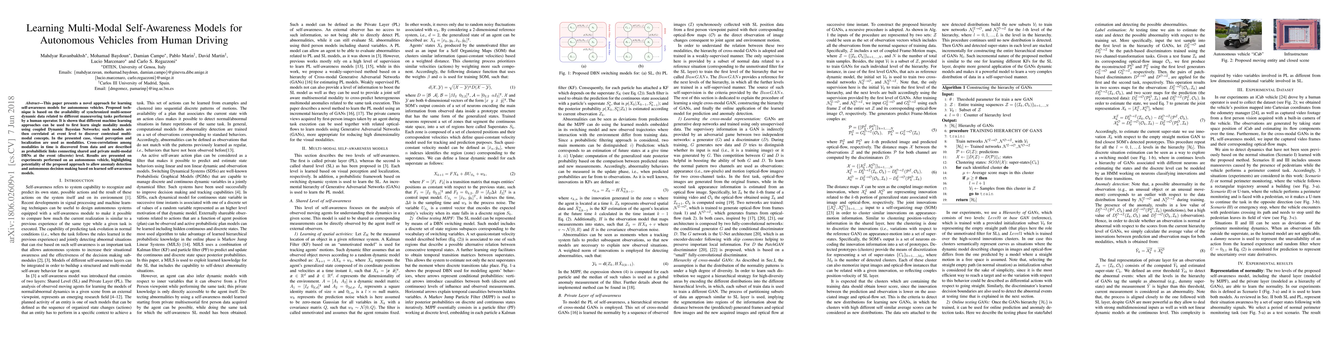 This paper presents a novel approach for learning self-awareness models for autonomous vehicles. The proposed technique is based on the availability of synchronized multi-sensor dynamic data related to different maneuvering tasks performed by a human operator. It is shown that different machine learning approaches can be used to first learn single modality models using coupled Dynamic Bayesian Networks; such models are then correlated at event level to discover contextual multi-modal concepts. In the presented case, visual perception and localization are used as modalities. Cross-correlations among modalities in time is discovered from data and are described as probabilistic links connecting shared and private multi-modal DBNs at the event (discrete) level. Results are presented on experiments performed on an autonomous vehicle, highlighting potentiality of the proposed approach to allow anomaly detection and autonomous decision making based on learned self-awareness models.