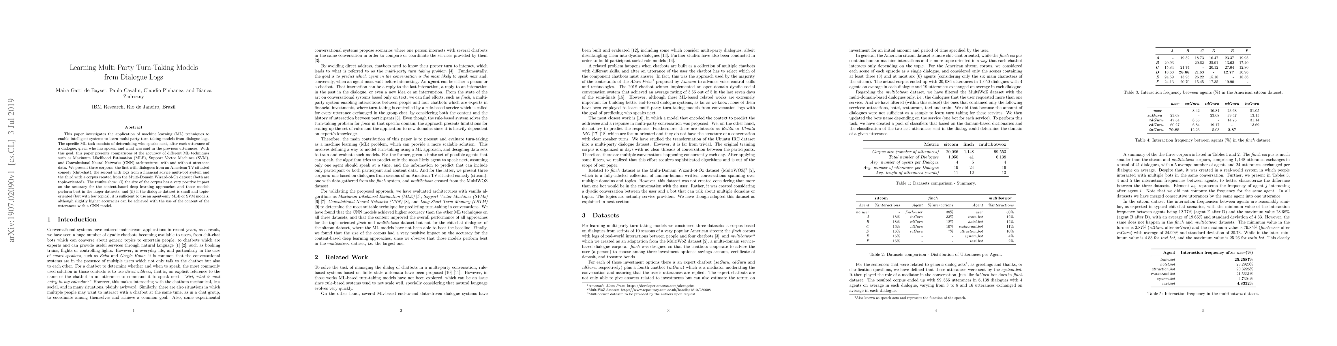 This paper investigates the application of machine learning (ML) techniques to enable intelligent systems to learn multi-party turn-taking models from dialogue logs. The specific ML task consists of determining who speaks next, after each utterance of a dialogue, given who has spoken and what was said in the previous utterances. With this goal, this paper presents comparisons of the accuracy of different ML techniques such as Maximum Likelihood Estimation (MLE), Support Vector Machines (SVM), and Convolutional Neural Networks (CNN) architectures, with and without utterance data. We present three corpora: the first with dialogues from an American TV situated comedy (chit-chat), the second with logs from a financial advice multi-bot system and the third with a corpus created from the Multi-Domain Wizard-of-Oz dataset (both are topic-oriented). The results show: (i) the size of the corpus has a very positive impact on the accuracy for the content-based deep learning approaches and those models perform best in the larger datasets; and (ii) if the dialogue dataset is small and topic-oriented (but with few topics), it is sufficient to use an agent-only MLE or SVM models, although slightly higher accuracies can be achieved with the use of the content of the utterances with a CNN model.