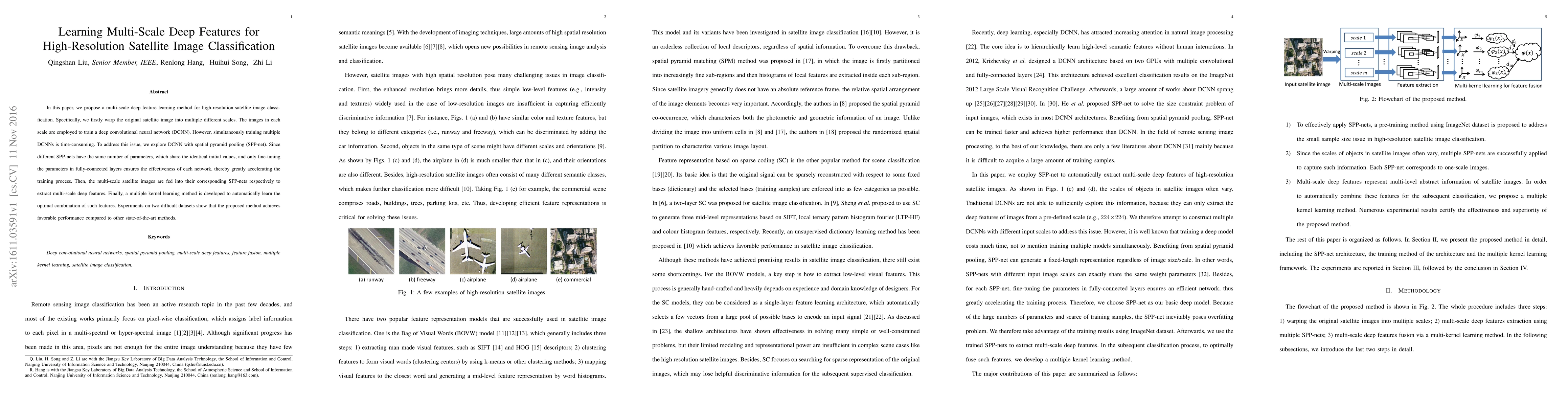 This paper proposes a multi-scale deep learning method for high-resolution satellite image classification using spatial pyramid pooling networks to efficiently train multiple networks. It combines multi-scale features through multiple kernel learning for optimal classification performance.