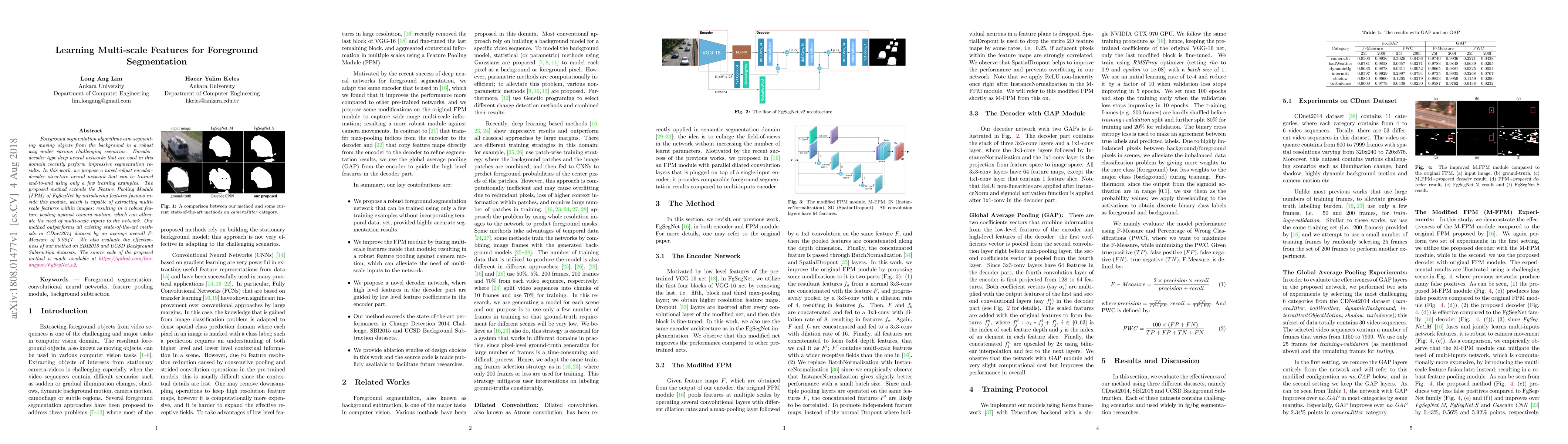 Foreground segmentation algorithms aim segmenting moving objects from the background in a robust way under various challenging scenarios. Encoder-decoder type deep neural networks that are used in this domain recently perform impressive segmentation results. In this work, we propose a novel robust encoder-decoder structure neural network that can be trained end-to-end using only a few training examples. The proposed method extends the Feature Pooling Module (FPM) of FgSegNet by introducing features fusions inside this module, which is capable of extracting multi-scale features within images; resulting in a robust feature pooling against camera motion, which can alleviate the need of multi-scale inputs to the network. Our method outperforms all existing state-of-the-art methods in CDnet2014 dataset by an average overall F-Measure of 0.9847. We also evaluate the effectiveness of our method on SBI2015 and UCSD Background Subtraction datasets. The source code of the proposed method is made available at https://github.com/lim-anggun/FgSegNet_v2 .