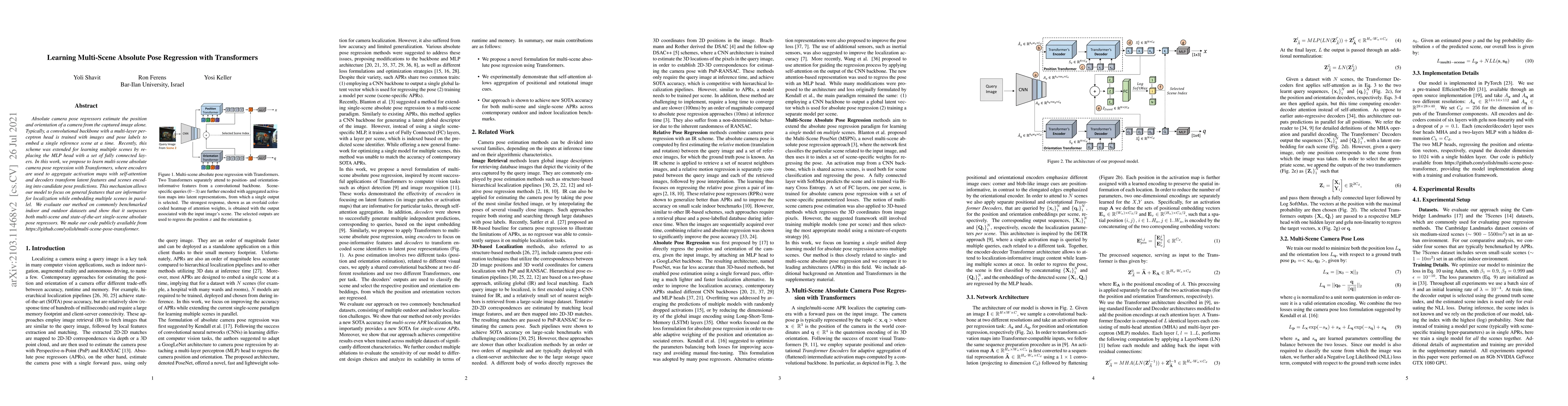 This paper proposes using Transformers for multi-scene absolute camera pose regression, leveraging self-attention to aggregate features across scenes and outperform both single-scene and multi-scene regressors on benchmark datasets. The method embeds multiple scenes in parallel and achieves superior localization accuracy.