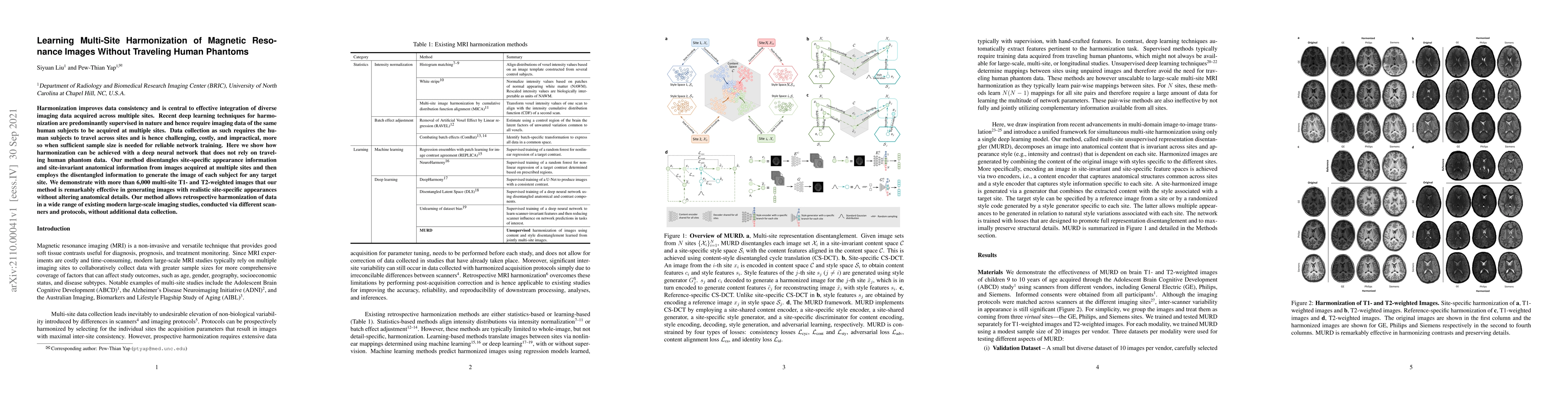 Harmonization improves data consistency and is central to effective integration of diverse imaging data acquired across multiple sites. Recent deep learning techniques for harmonization are predominantly supervised in nature and hence require imaging data of the same human subjects to be acquired at multiple sites. Data collection as such requires the human subjects to travel across sites and is hence challenging, costly, and impractical, more so when sufficient sample size is needed for reliable network training. Here we show how harmonization can be achieved with a deep neural network that does not rely on traveling human phantom data. Our method disentangles site-specific appearance information and site-invariant anatomical information from images acquired at multiple sites and then employs the disentangled information to generate the image of each subject for any target site. We demonstrate with more than 6,000 multi-site T1- and T2-weighted images that our method is remarkably effective in generating images with realistic site-specific appearances without altering anatomical details. Our method allows retrospective harmonization of data in a wide range of existing modern large-scale imaging studies, conducted via different scanners and protocols, without additional data collection.