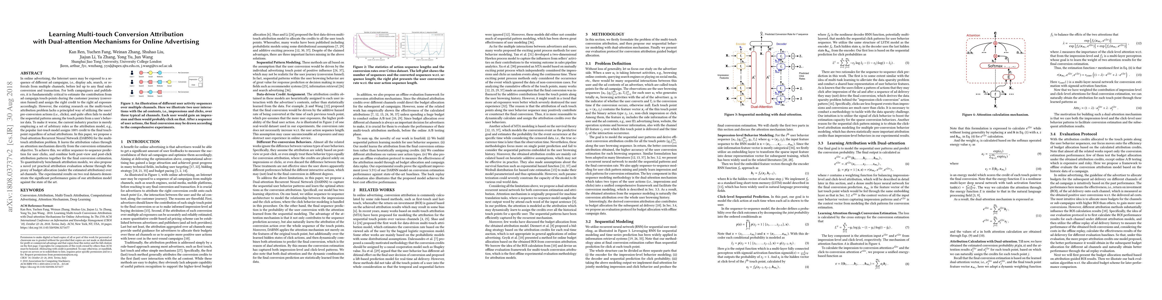 This paper proposes a Dual-attention Recurrent Neural Network (DARNN) to address the multi-touch attribution problem in online advertising, aiming to accurately estimate the contribution of various ad campaigns in a user's journey. The model leverages an attention mechanism to learn attribution values directly from conversion estimation, outperforming existing methods that rely on arbitrary rules.