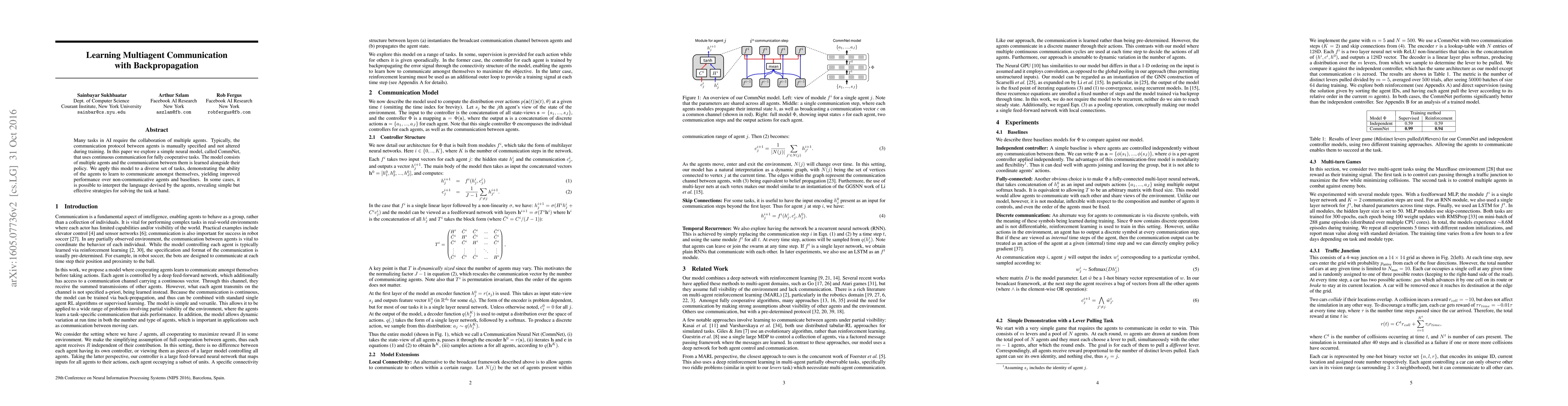 Many tasks in AI require the collaboration of multiple agents. Typically, the communication protocol between agents is manually specified and not altered during training. In this paper we explore a simple neural model, called CommNet, that uses continuous communication for fully cooperative tasks. The model consists of multiple agents and the communication between them is learned alongside their policy. We apply this model to a diverse set of tasks, demonstrating the ability of the agents to learn to communicate amongst themselves, yielding improved performance over non-communicative agents and baselines. In some cases, it is possible to interpret the language devised by the agents, revealing simple but effective strategies for solving the task at hand.