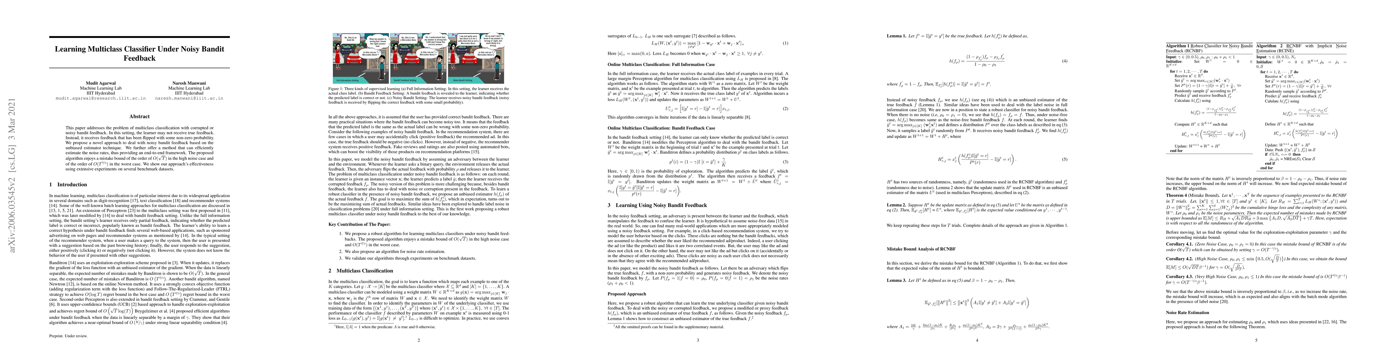 This paper proposes a novel approach for multiclass classification under noisy bandit feedback using unbiased estimator techniques. It offers a method to efficiently estimate noise rates, providing an end-to-end framework with a mistake bound of O(√T) in the high noise case and O(T^(2/3)) in the worst case.