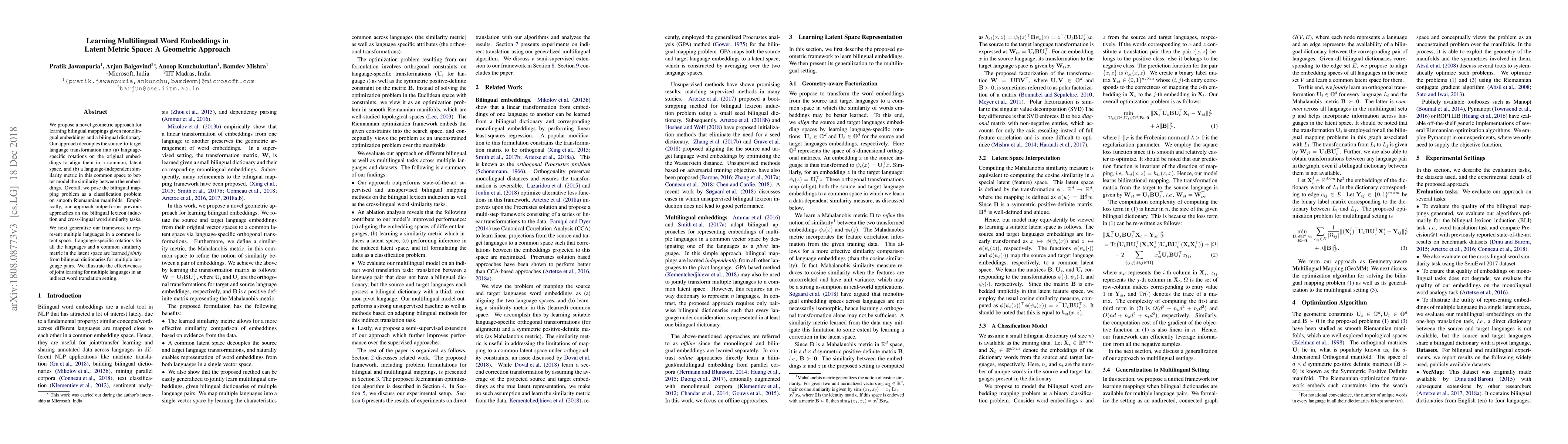 This paper introduces a geometric method for learning multilingual word embeddings by aligning language-specific embeddings to a common latent space using rotations and a shared similarity metric. The approach outperforms previous methods in bilingual lexicon induction and cross-lingual word similarity tasks, and extends to jointly represent multiple languages, enhancing zero-shot word translation.
