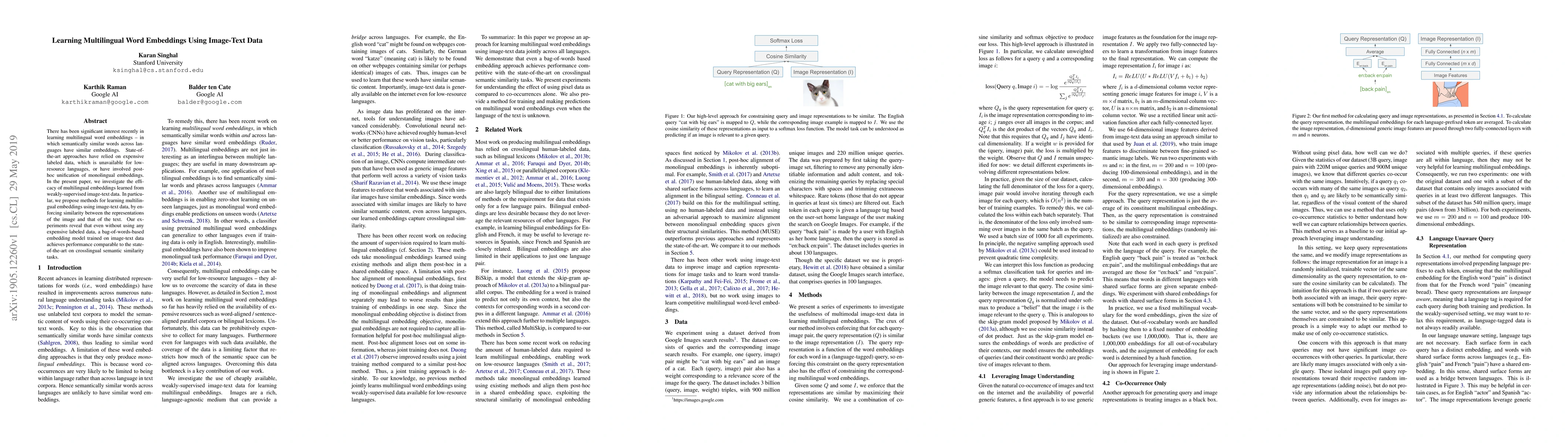 This paper proposes methods to learn multilingual word embeddings using weakly-supervised image-text data, achieving performance comparable to state-of-the-art approaches without relying on expensive labeled data. The approach enforces similarity between image and text representations, demonstrating effective crosslingual semantic similarity.