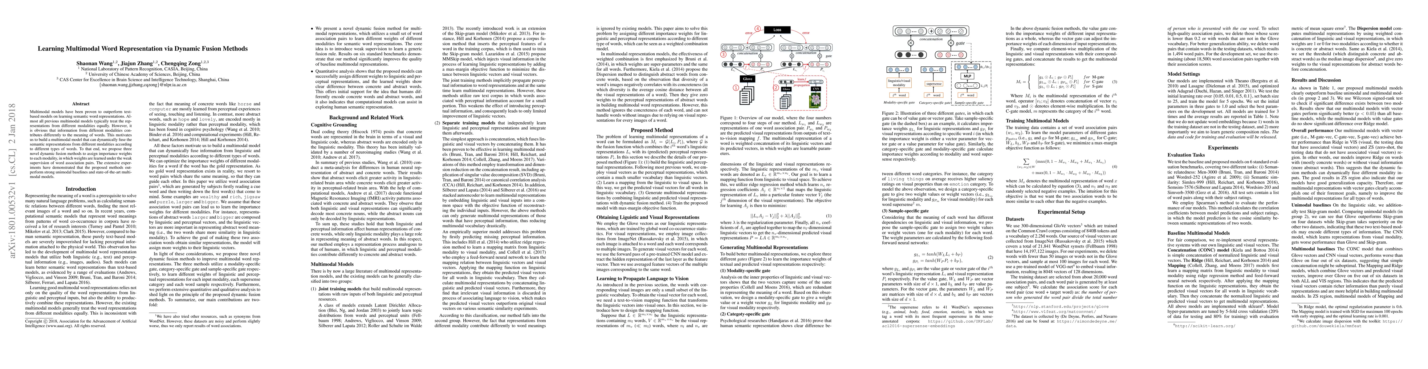 This paper proposes dynamic fusion methods to create multimodal word representations that adaptively weigh contributions from different modalities based on word types, outperforming both unimodal and existing multimodal models. The dynamic weights are learned using weak supervision from word association pairs.