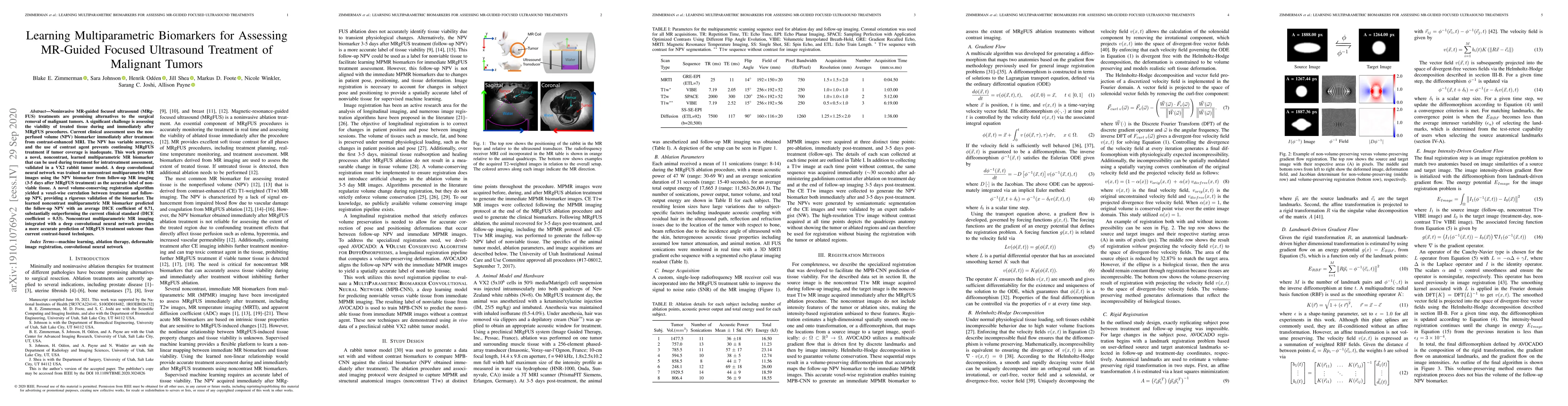 This paper introduces a novel noncontrast, learned multiparametric MR biomarker for assessing MR-guided focused ultrasound (MRgFUS) treatment of malignant tumors, significantly improving accuracy over current contrast-based methods. The deep convolutional neural network trained on multiparametric MR images outperformed the clinical standard, achieving a DICE coefficient of 0.71.