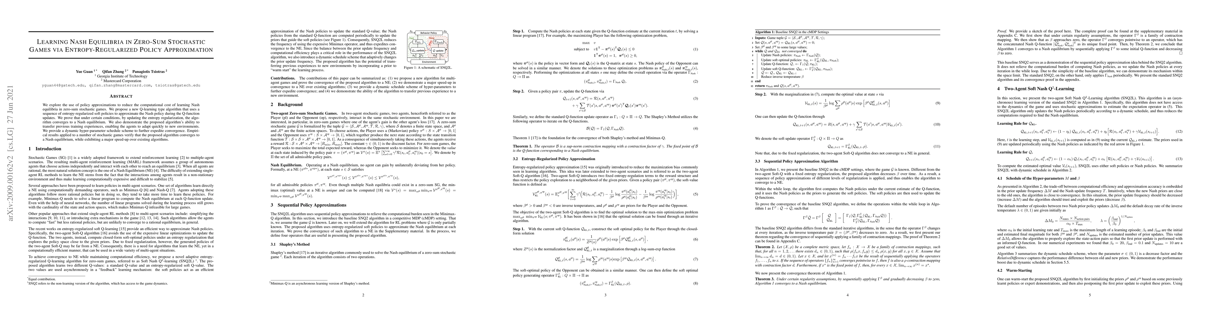 The paper introduces an entropy-regularized policy approximation method for learning Nash equilibria in zero-sum stochastic games, proving convergence and demonstrating empirical efficiency.