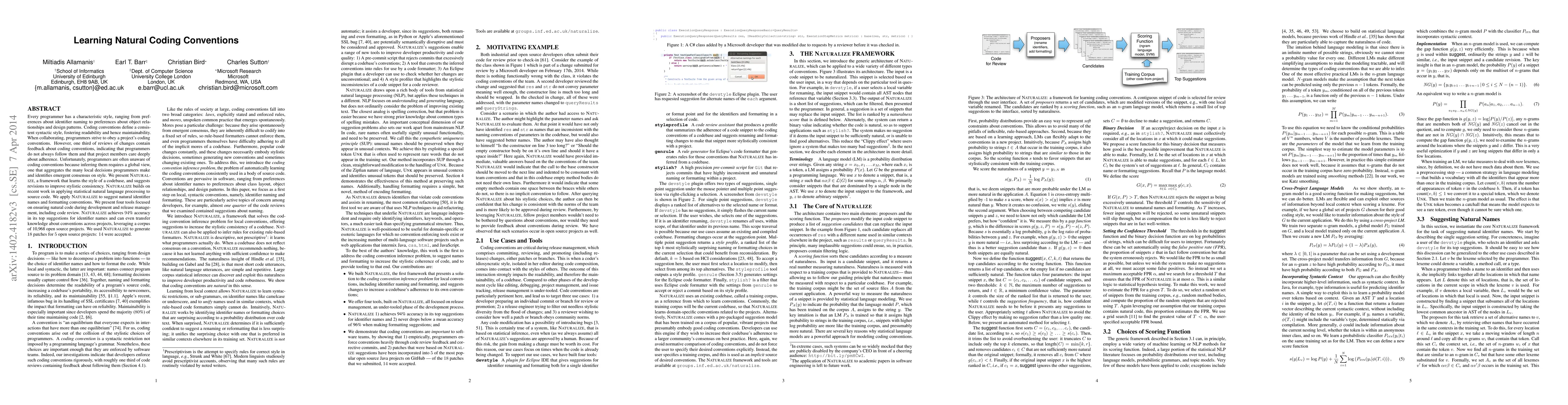 The paper introduces NATURALIZE, a framework that learns and suggests coding conventions to improve code consistency, achieving 94% accuracy in identifier name suggestions. It demonstrates the tool's effectiveness in generating and integrating 14 out of 18 patches in open source projects.