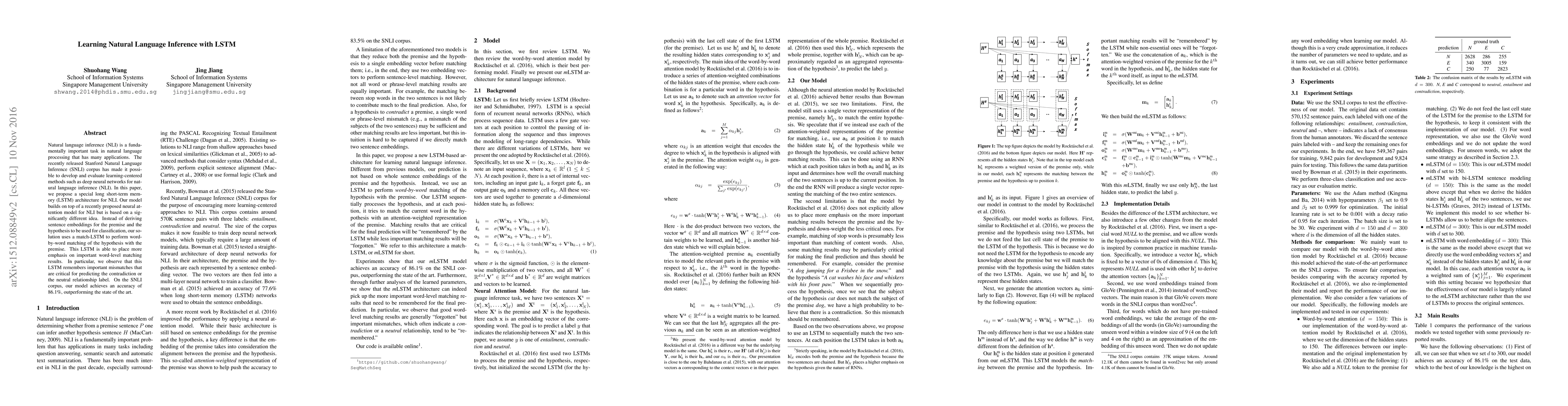 This paper proposes an LSTM architecture for natural language inference (NLI) that uses a match-LSTM for word-by-word comparison, achieving an accuracy of 86.1% on the SNLI corpus and outperforming existing models. The approach emphasizes critical mismatches for determining relationship labels.