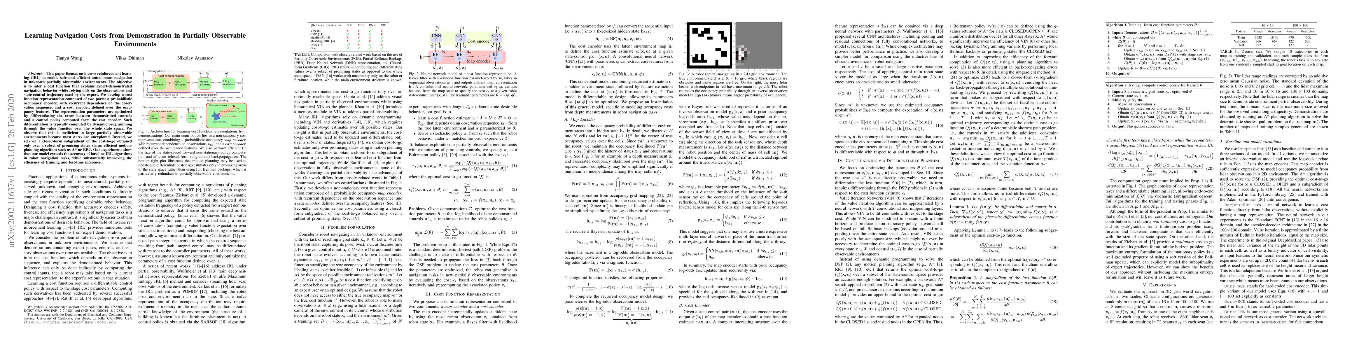 This paper proposes an inverse reinforcement learning method for autonomous navigation in partially observable environments, using a cost function representation optimized via a computationally efficient subgradient approach. The model outperforms baselines while significantly improving training and inference efficiency.