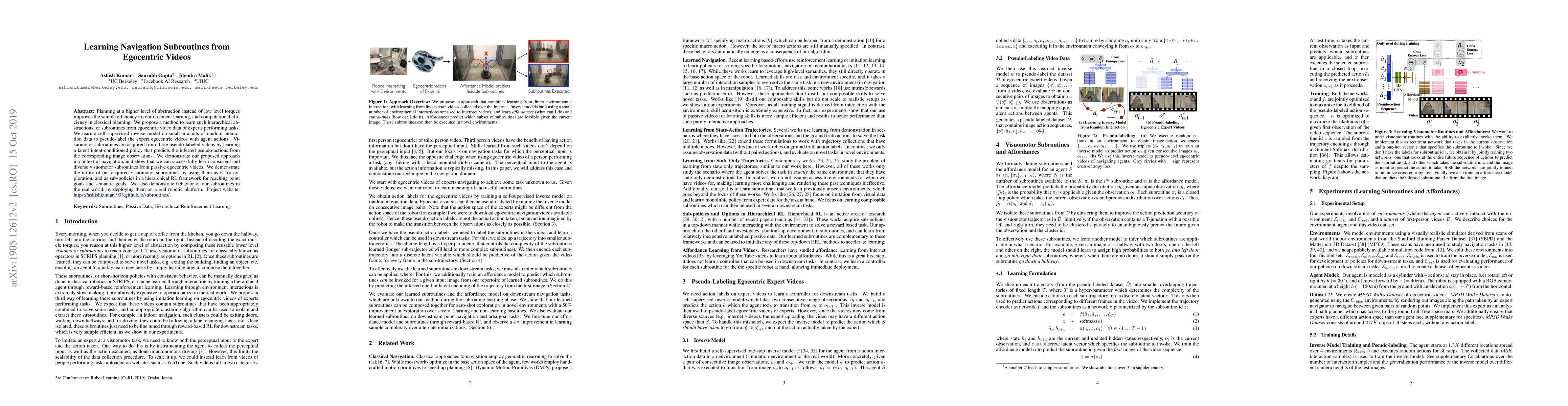This paper proposes a method to learn hierarchical navigation subroutines from egocentric videos of experts, using self-supervised inverse modeling and latent intent-conditioned policies. The acquired visuomotor subroutines improve exploration and hierarchical reinforcement learning, and are successfully deployed on a real robotic platform.