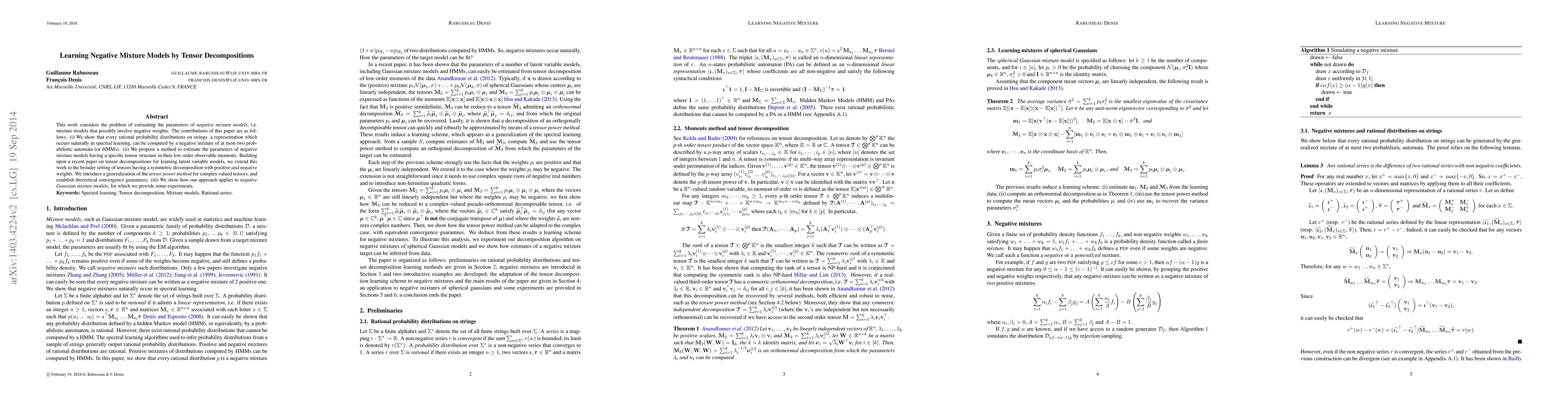 This paper estimates parameters of negative mixture models using tensor decompositions, demonstrating that rational probability distributions on strings can be represented by negative mixtures of two probabilistic automata. It proposes a method for tensor decompositions with symmetric structures and positive/negative weights, extending previous work and providing theoretical convergence guarantees, with applications to negative Gaussian mixture models.