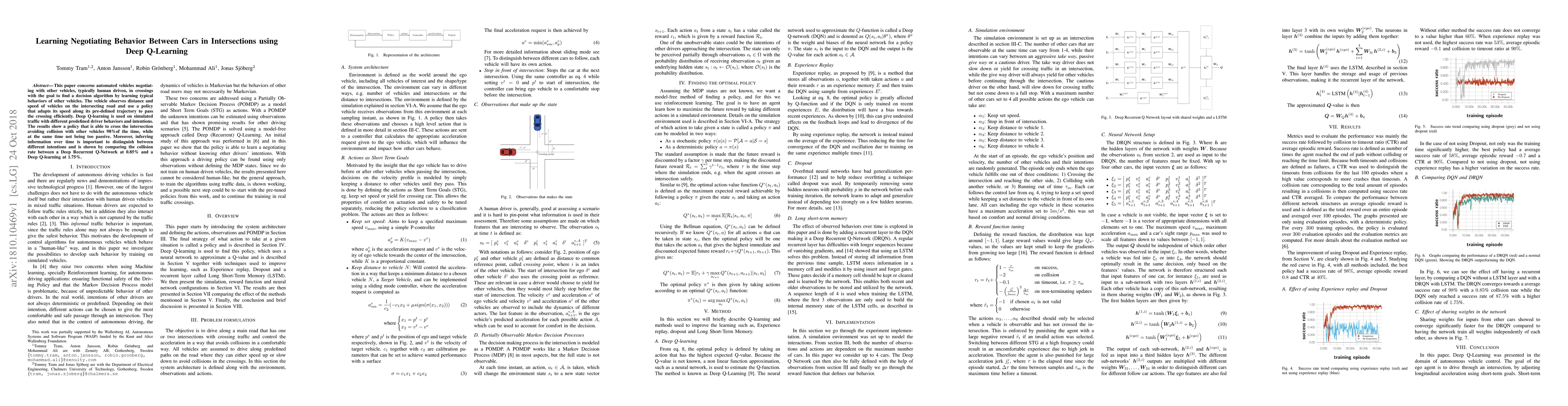 This paper concerns automated vehicles negotiating with other vehicles, typically human driven, in crossings with the goal to find a decision algorithm by learning typical behaviors of other vehicles. The vehicle observes distance and speed of vehicles on the intersecting road and use a policy that adapts its speed along its pre-defined trajectory to pass the crossing efficiently. Deep Q-learning is used on simulated traffic with different predefined driver behaviors and intentions. The results show a policy that is able to cross the intersection avoiding collision with other vehicles 98% of the time, while at the same time not being too passive. Moreover, inferring information over time is important to distinguish between different intentions and is shown by comparing the collision rate between a Deep Recurrent Q-Network at 0.85% and a Deep Q-learning at 1.75%.