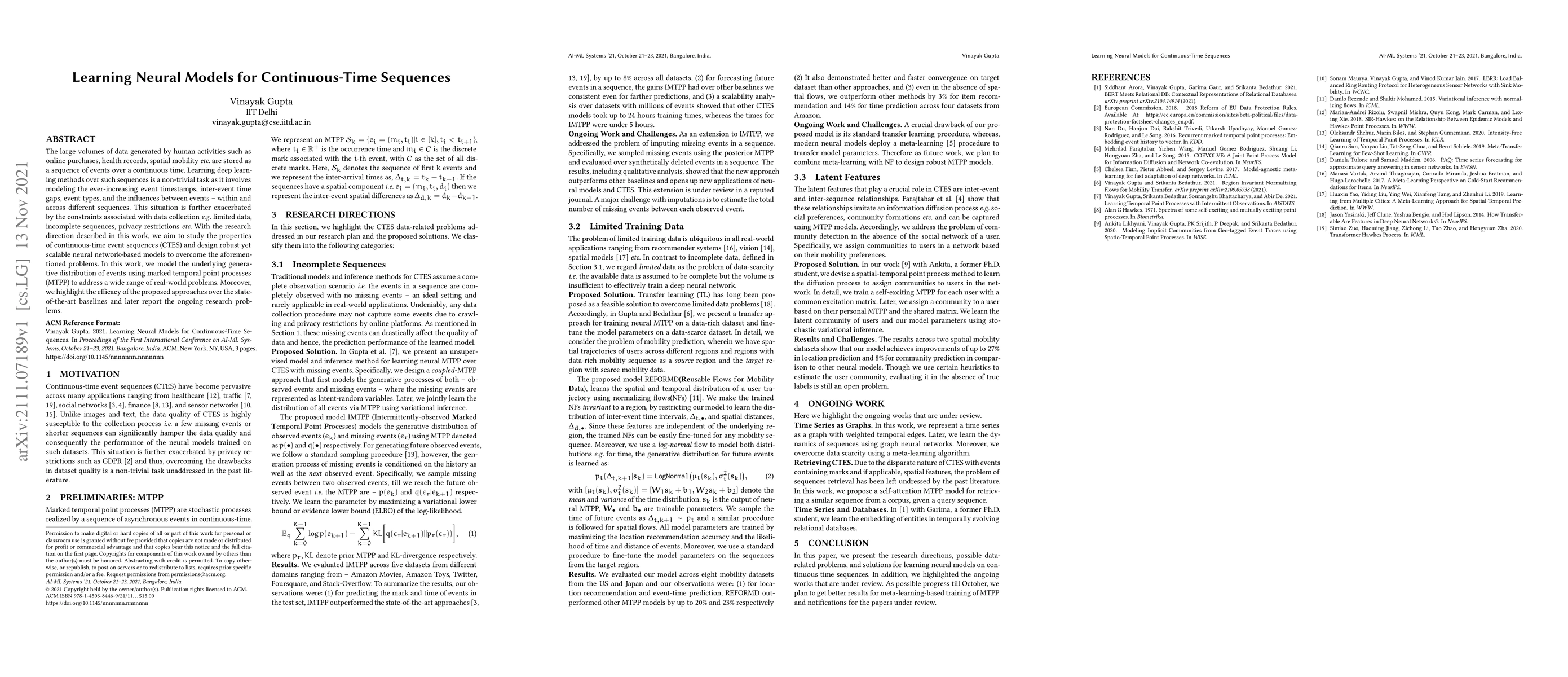This paper explores deep learning methods for modeling continuous-time event sequences (CTES), focusing on neural network-based models that address challenges like event timestamps, inter-event gaps, and influences between events. The authors propose using marked temporal point processes to model the generative distribution of events and demonstrate the effectiveness of their approach against state-of-the-art baselines.