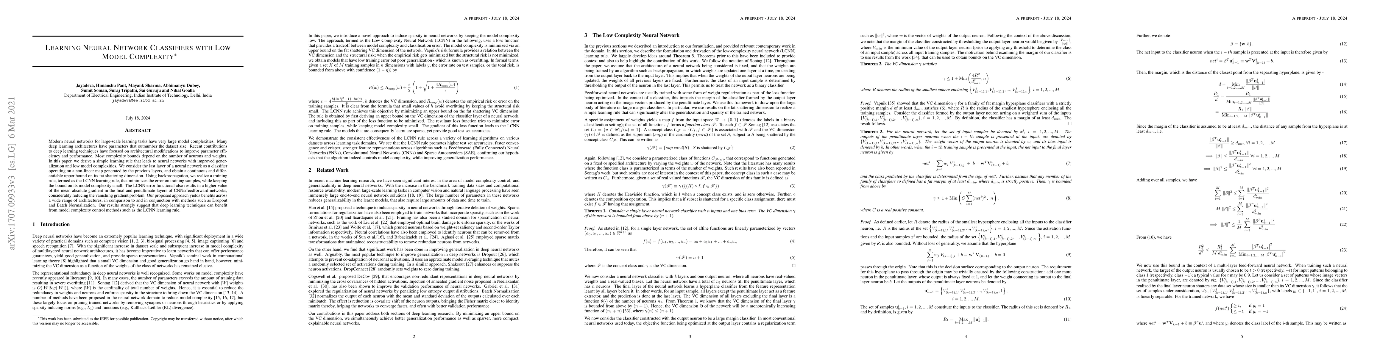 Modern neural network architectures for large-scale learning tasks have substantially higher model complexities, which makes understanding, visualizing and training these architectures difficult. Recent contributions to deep learning techniques have focused on architectural modifications to improve parameter efficiency and performance. In this paper, we derive a continuous and differentiable error functional for a neural network that minimizes its empirical error as well as a measure of the model complexity. The latter measure is obtained by deriving a differentiable upper bound on the Vapnik-Chervonenkis (VC) dimension of the classifier layer of a class of deep networks. Using standard backpropagation, we realize a training rule that tries to minimize the error on training samples, while improving generalization by keeping the model complexity low. We demonstrate the effectiveness of our formulation (the Low Complexity Neural Network - LCNN) across several deep learning algorithms, and a variety of large benchmark datasets. We show that hidden layer neurons in the resultant networks learn features that are crisp, and in the case of image datasets, quantitatively sharper. Our proposed approach yields benefits across a wide range of architectures, in comparison to and in conjunction with methods such as Dropout and Batch Normalization, and our results strongly suggest that deep learning techniques can benefit from model complexity control methods such as the LCNN learning rule.