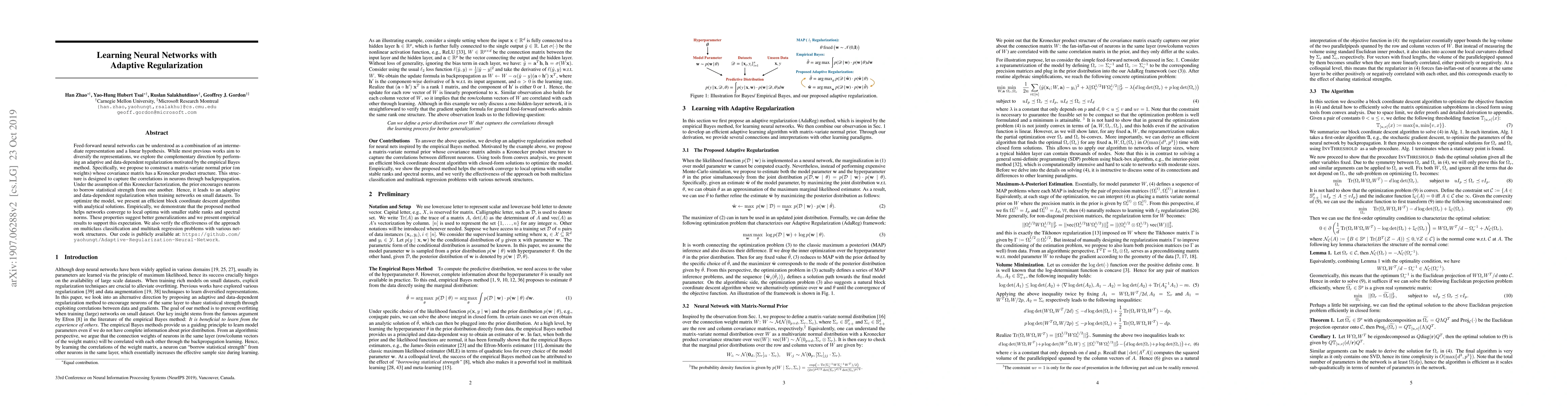 This paper proposes a new method for training neural networks that uses adaptive regularization to improve generalization performance on small datasets. It achieves this through a matrix-variate normal prior with a Kronecker product structure that encourages neurons to borrow strength from one another.