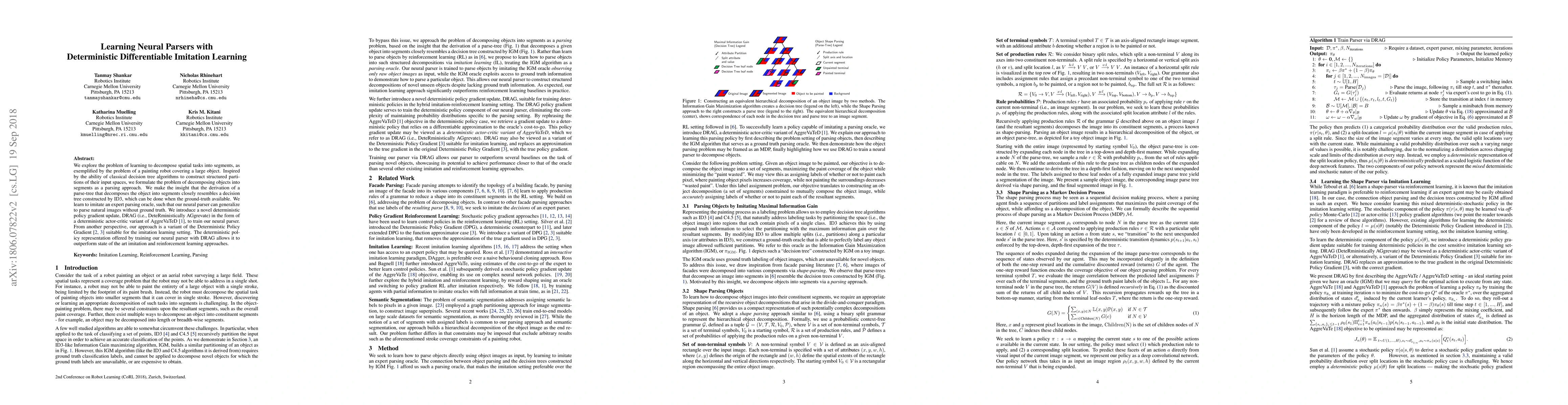 We explore the problem of learning to decompose spatial tasks into segments, as exemplified by the problem of a painting robot covering a large object. Inspired by the ability of classical decision tree algorithms to construct structured partitions of their input spaces, we formulate the problem of decomposing objects into segments as a parsing approach. We make the insight that the derivation of a parse-tree that decomposes the object into segments closely resembles a decision tree constructed by ID3, which can be done when the ground-truth available. We learn to imitate an expert parsing oracle, such that our neural parser can generalize to parse natural images without ground truth. We introduce a novel deterministic policy gradient update, DRAG (i.e., DeteRministically AGgrevate) in the form of a deterministic actor-critic variant of AggreVaTeD, to train our neural parser. From another perspective, our approach is a variant of the Deterministic Policy Gradient suitable for the imitation learning setting. The deterministic policy representation offered by training our neural parser with DRAG allows it to outperform state of the art imitation and reinforcement learning approaches.