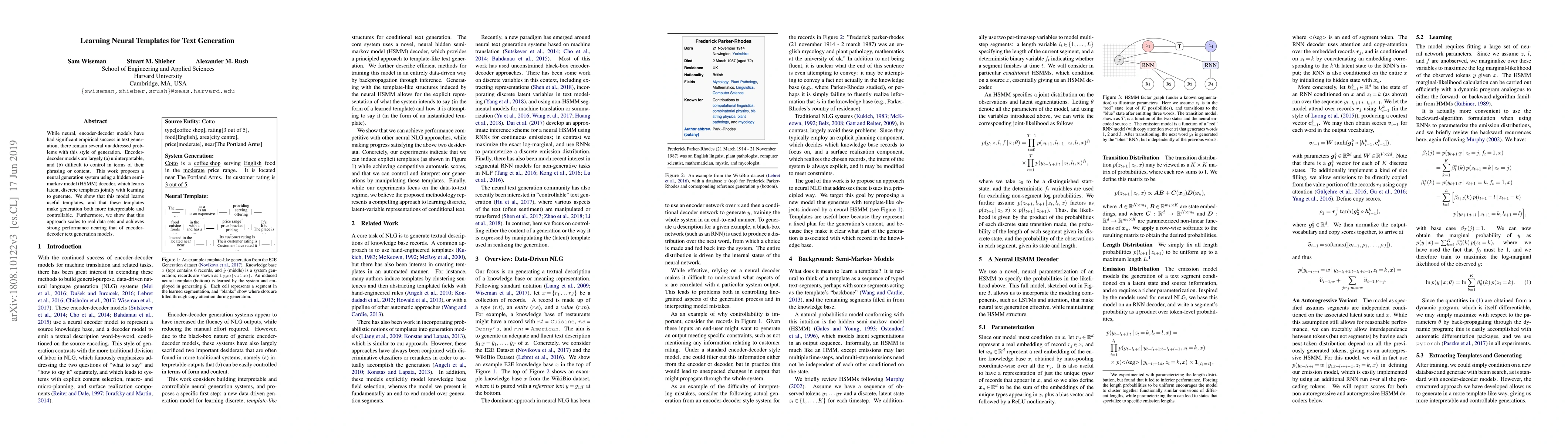 This paper proposes a neural generation system using a hidden semi-markov model (HSMM) decoder to learn latent, discrete templates, enhancing interpretability and controllability over traditional encoder-decoder models. The approach scales well and achieves performance comparable to state-of-the-art text generation models.