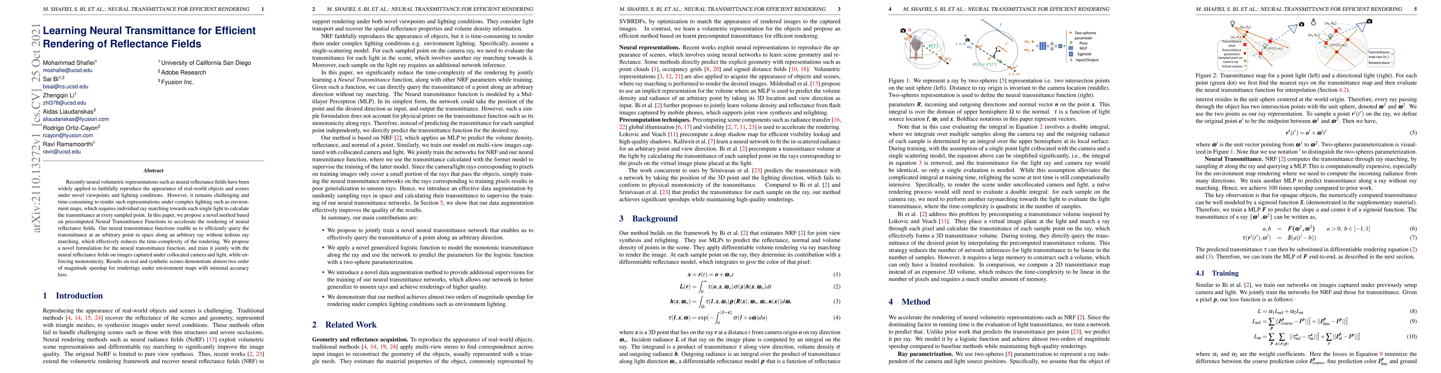 This paper proposes a novel method using precomputed Neural Transmittance Functions to accelerate rendering of neural reflectance fields. The method efficiently queries transmittance without ray marching, achieving significant speedups in rendering under complex lighting with minimal loss in accuracy.