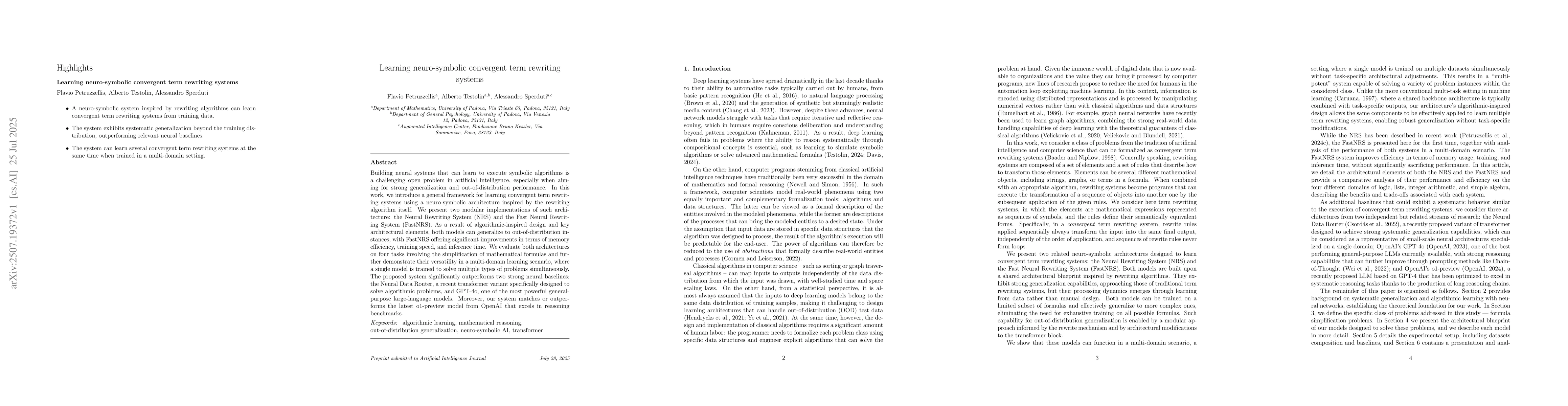 Building neural systems that can learn to execute symbolic algorithms is a challenging open problem in artificial intelligence, especially when aiming for strong generalization and out-of-distribution performance. In this work, we introduce a general framework for learning convergent term rewriting systems using a neuro-symbolic architecture inspired by the rewriting algorithm itself. We present two modular implementations of such architecture: the Neural Rewriting System (NRS) and the Fast Neural Rewriting System (FastNRS). As a result of algorithmic-inspired design and key architectural elements, both models can generalize to out-of-distribution instances, with FastNRS offering significant improvements in terms of memory efficiency, training speed, and inference time. We evaluate both architectures on four tasks involving the simplification of mathematical formulas and further demonstrate their versatility in a multi-domain learning scenario, where a single model is trained to solve multiple types of problems simultaneously. The proposed system significantly outperforms two strong neural baselines: the Neural Data Router, a recent transformer variant specifically designed to solve algorithmic problems, and GPT-4o, one of the most powerful general-purpose large-language models. Moreover, our system matches or outperforms the latest o1-preview model from OpenAI that excels in reasoning benchmarks.