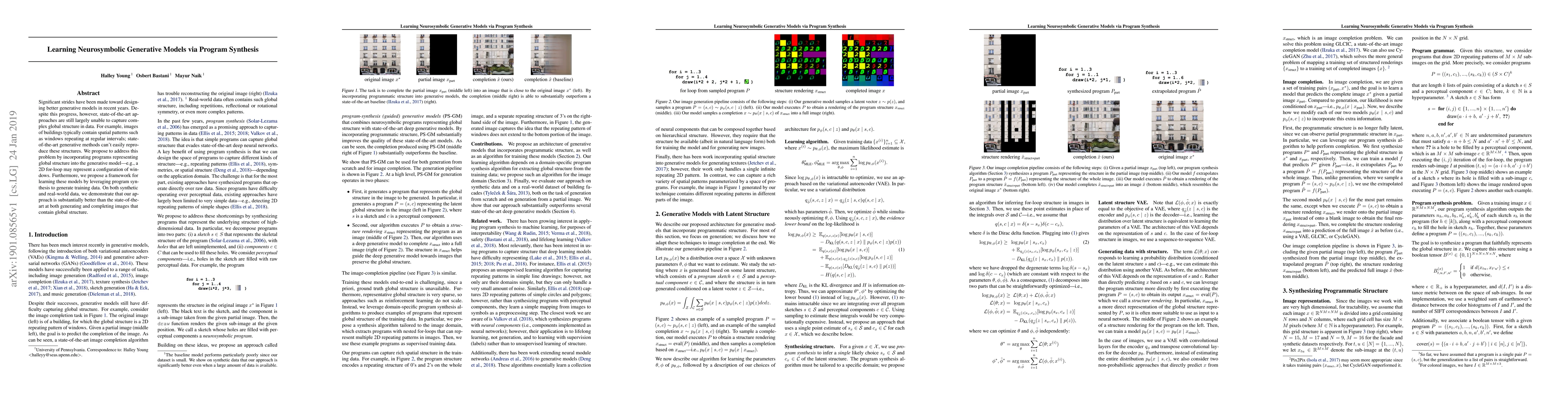 Significant strides have been made toward designing better generative models in recent years. Despite this progress, however, state-of-the-art approaches are still largely unable to capture complex global structure in data. For example, images of buildings typically contain spatial patterns such as windows repeating at regular intervals; state-of-the-art generative methods can't easily reproduce these structures. We propose to address this problem by incorporating programs representing global structure into the generative model---e.g., a 2D for-loop may represent a configuration of windows. Furthermore, we propose a framework for learning these models by leveraging program synthesis to generate training data. On both synthetic and real-world data, we demonstrate that our approach is substantially better than the state-of-the-art at both generating and completing images that contain global structure.