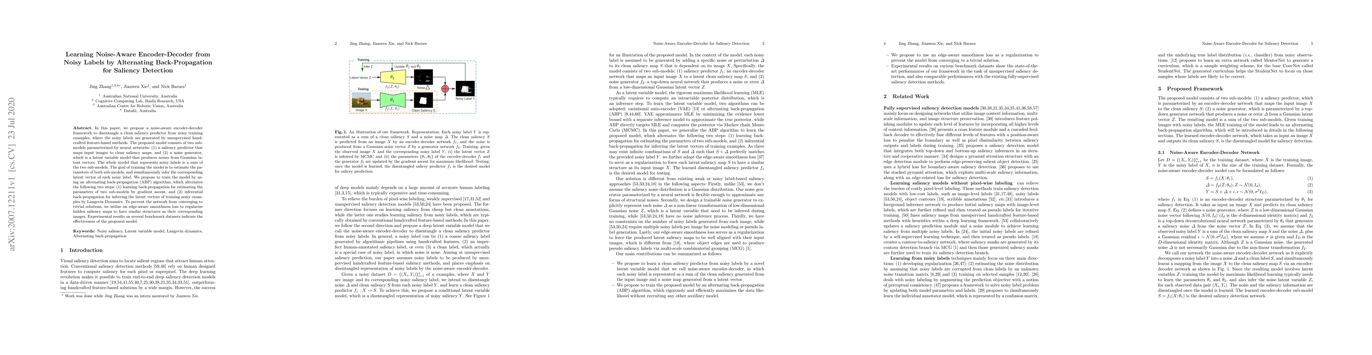 This paper introduces a noise-aware encoder-decoder framework for saliency detection using noisy labels, employing an alternating back-propagation algorithm to disentangle clean saliency maps from noisy examples. The model includes a saliency predictor and a noise generator, trained to infer latent vectors and regularized to maintain edge-aware smoothness.