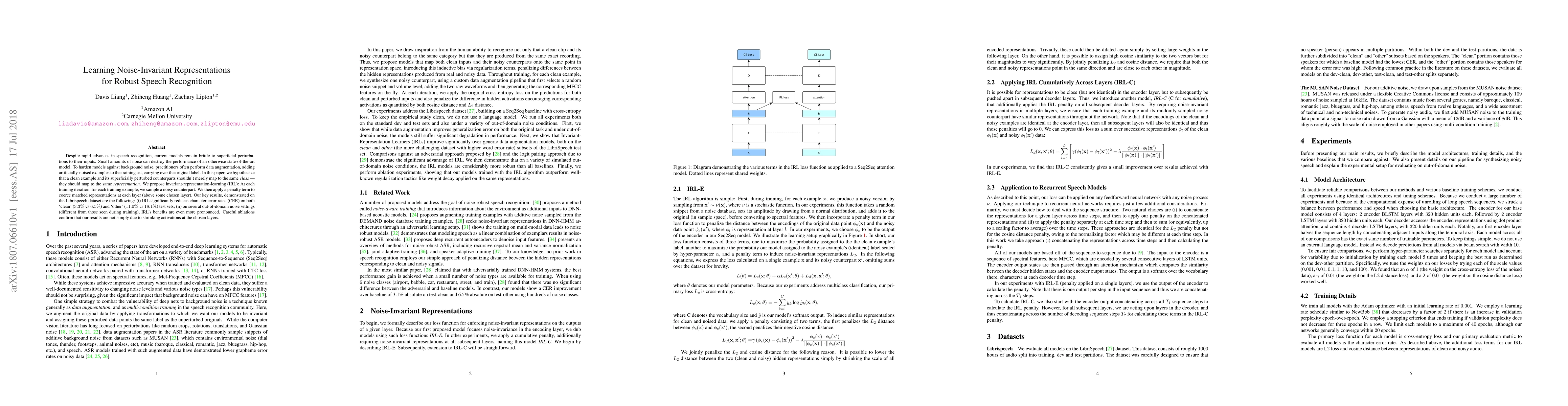 Despite rapid advances in speech recognition, current models remain brittle to superficial perturbations to their inputs. Small amounts of noise can destroy the performance of an otherwise state-of-the-art model. To harden models against background noise, practitioners often perform data augmentation, adding artificially-noised examples to the training set, carrying over the original label. In this paper, we hypothesize that a clean example and its superficially perturbed counterparts shouldn't merely map to the same class --- they should map to the same representation. We propose invariant-representation-learning (IRL): At each training iteration, for each training example,we sample a noisy counterpart. We then apply a penalty term to coerce matched representations at each layer (above some chosen layer). Our key results, demonstrated on the Librispeech dataset are the following: (i) IRL significantly reduces character error rates (CER) on both 'clean' (3.3% vs 6.5%) and 'other' (11.0% vs 18.1%) test sets; (ii) on several out-of-domain noise settings (different from those seen during training), IRL's benefits are even more pronounced. Careful ablations confirm that our results are not simply due to shrinking activations at the chosen layers.