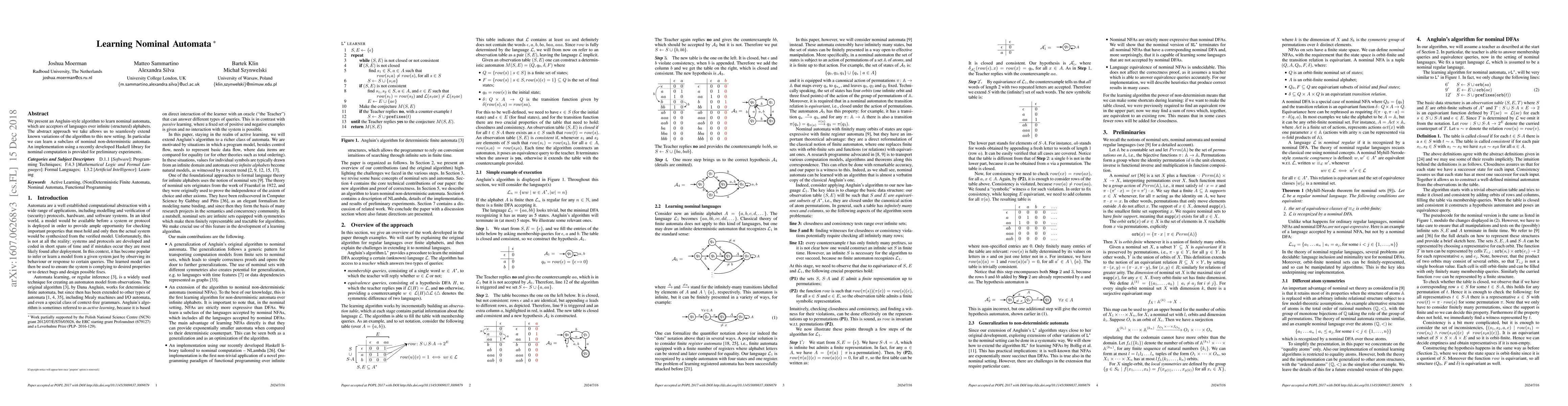 This paper introduces an Angluin-style algorithm for learning nominal automata, which handle languages over infinite structured alphabets, and extends existing learning techniques to this new context. Preliminary experiments are conducted using a Haskell library for nominal computation.