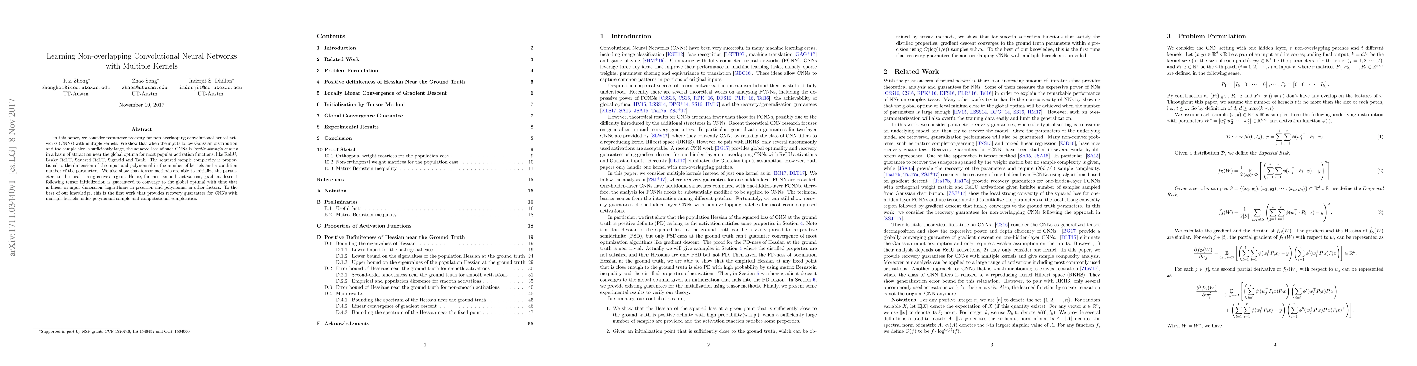 In this paper, we consider parameter recovery for non-overlapping convolutional neural networks (CNNs) with multiple kernels. We show that when the inputs follow Gaussian distribution and the sample size is sufficiently large, the squared loss of such CNNs is $\mathit{~locally~strongly~convex}$ in a basin of attraction near the global optima for most popular activation functions, like ReLU, Leaky ReLU, Squared ReLU, Sigmoid and Tanh. The required sample complexity is proportional to the dimension of the input and polynomial in the number of kernels and a condition number of the parameters. We also show that tensor methods are able to initialize the parameters to the local strong convex region. Hence, for most smooth activations, gradient descent following tensor initialization is guaranteed to converge to the global optimal with time that is linear in input dimension, logarithmic in precision and polynomial in other factors. To the best of our knowledge, this is the first work that provides recovery guarantees for CNNs with multiple kernels under polynomial sample and computational complexities.