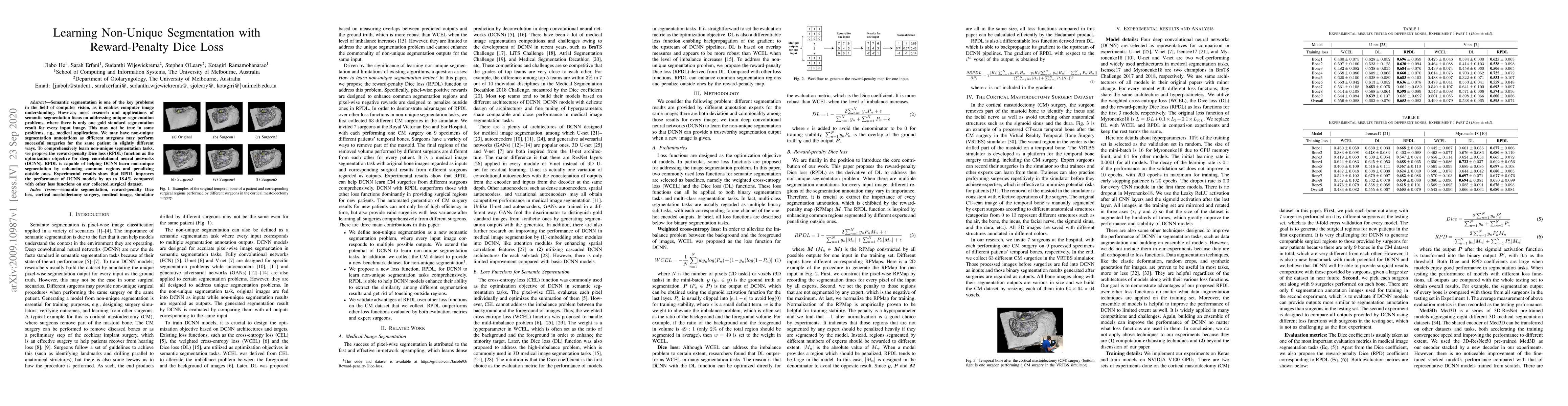 Semantic segmentation is one of the key problems in the field of computer vision, as it enables computer image understanding. However, most research and applications of semantic segmentation focus on addressing unique segmentation problems, where there is only one gold standard segmentation result for every input image. This may not be true in some problems, e.g., medical applications. We may have non-unique segmentation annotations as different surgeons may perform successful surgeries for the same patient in slightly different ways. To comprehensively learn non-unique segmentation tasks, we propose the reward-penalty Dice loss (RPDL) function as the optimization objective for deep convolutional neural networks (DCNN). RPDL is capable of helping DCNN learn non-unique segmentation by enhancing common regions and penalizing outside ones. Experimental results show that RPDL improves the performance of DCNN models by up to 18.4% compared with other loss functions on our collected surgical dataset.