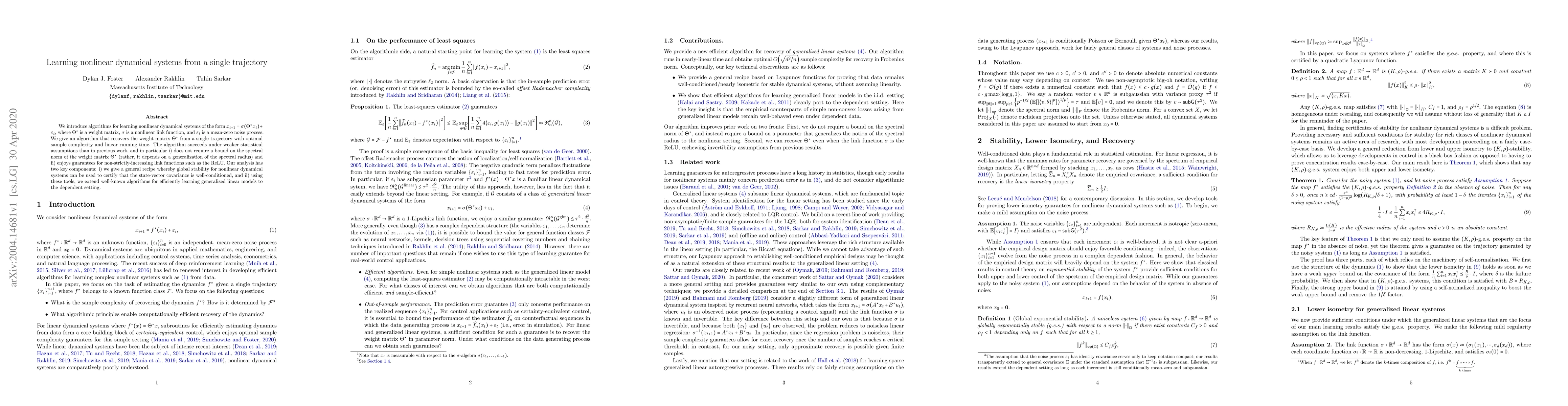 We introduce algorithms for learning nonlinear dynamical systems of the form $x_{t+1}=\sigma(\Theta^{\star}x_t)+\varepsilon_t$, where $\Theta^{\star}$ is a weight matrix, $\sigma$ is a nonlinear link function, and $\varepsilon_t$ is a mean-zero noise process. We give an algorithm that recovers the weight matrix $\Theta^{\star}$ from a single trajectory with optimal sample complexity and linear running time. The algorithm succeeds under weaker statistical assumptions than in previous work, and in particular i) does not require a bound on the spectral norm of the weight matrix $\Theta^{\star}$ (rather, it depends on a generalization of the spectral radius) and ii) enjoys guarantees for non-strictly-increasing link functions such as the ReLU. Our analysis has two key components: i) we give a general recipe whereby global stability for nonlinear dynamical systems can be used to certify that the state-vector covariance is well-conditioned, and ii) using these tools, we extend well-known algorithms for efficiently learning generalized linear models to the dependent setting.