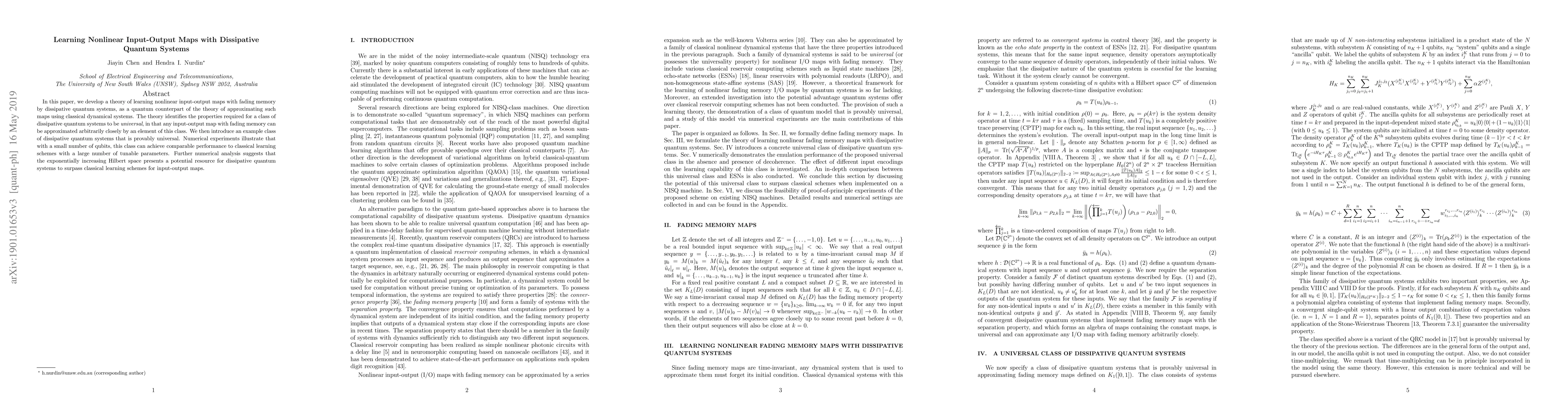 This paper develops a theory for learning nonlinear input-output maps using dissipative quantum systems, identifying properties that make certain quantum systems universally capable of approximating such maps. Numerical experiments show that a small number of qubits can achieve performance comparable to classical systems with many parameters, suggesting quantum systems may surpass classical methods due to their exponentially increasing Hilbert space.