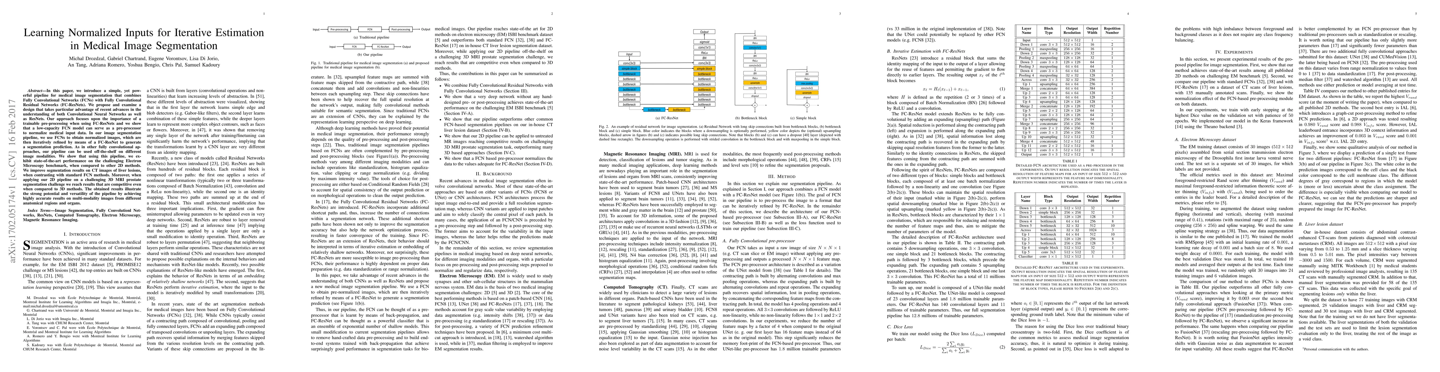 In this paper, we introduce a simple, yet powerful pipeline for medical image segmentation that combines Fully Convolutional Networks (FCNs) with Fully Convolutional Residual Networks (FC-ResNets). We propose and examine a design that takes particular advantage of recent advances in the understanding of both Convolutional Neural Networks as well as ResNets. Our approach focuses upon the importance of a trainable pre-processing when using FC-ResNets and we show that a low-capacity FCN model can serve as a pre-processor to normalize medical input data. In our image segmentation pipeline, we use FCNs to obtain normalized images, which are then iteratively refined by means of a FC-ResNet to generate a segmentation prediction. As in other fully convolutional approaches, our pipeline can be used off-the-shelf on different image modalities. We show that using this pipeline, we exhibit state-of-the-art performance on the challenging Electron Microscopy benchmark, when compared to other 2D methods. We improve segmentation results on CT images of liver lesions, when contrasting with standard FCN methods. Moreover, when applying our 2D pipeline on a challenging 3D MRI prostate segmentation challenge we reach results that are competitive even when compared to 3D methods. The obtained results illustrate the strong potential and versatility of the pipeline by achieving highly accurate results on multi-modality images from different anatomical regions and organs.
