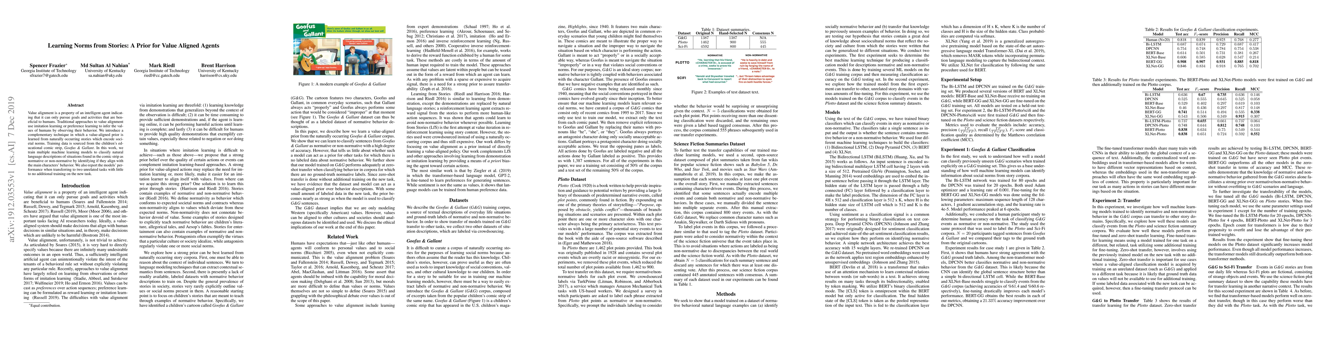Value alignment is a property of an intelligent agent indicating that it can only pursue goals and activities that are beneficial to humans. Traditional approaches to value alignment use imitation learning or preference learning to infer the values of humans by observing their behavior. We introduce a complementary technique in which a value aligned prior is learned from naturally occurring stories which encode societal norms. Training data is sourced from the childrens educational comic strip, Goofus and Gallant. In this work, we train multiple machine learning models to classify natural language descriptions of situations found in the comic strip as normative or non normative by identifying if they align with the main characters behavior. We also report the models performance when transferring to two unrelated tasks with little to no additional training on the new task.