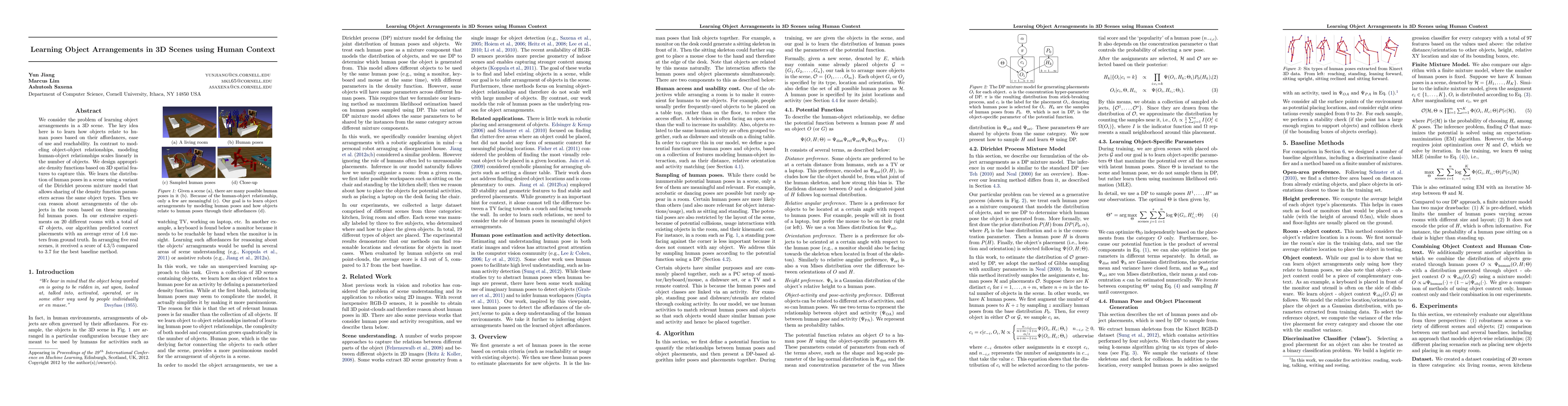 We consider the problem of learning object arrangements in a 3D scene. The key idea here is to learn how objects relate to human poses based on their affordances, ease of use and reachability. In contrast to modeling object-object relationships, modeling human-object relationships scales linearly in the number of objects. We design appropriate density functions based on 3D spatial features to capture this. We learn the distribution of human poses in a scene using a variant of the Dirichlet process mixture model that allows sharing of the density function parameters across the same object types. Then we can reason about arrangements of the objects in the room based on these meaningful human poses. In our extensive experiments on 20 different rooms with a total of 47 objects, our algorithm predicted correct placements with an average error of 1.6 meters from ground truth. In arranging five real scenes, it received a score of 4.3/5 compared to 3.7 for the best baseline method.