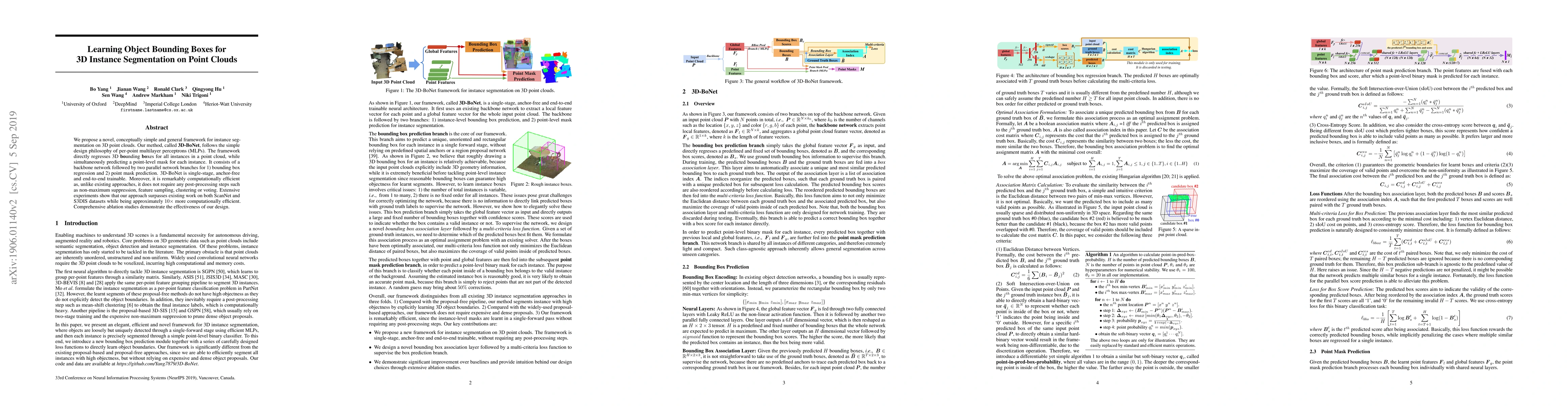 The paper introduces 3D-BoNet, a novel framework for 3D instance segmentation on point clouds, which directly regresses bounding boxes and predicts point-level masks in a single-stage, anchor-free, and computationally efficient manner. The method outperforms existing approaches on ScanNet and S3DIS datasets while being significantly faster.