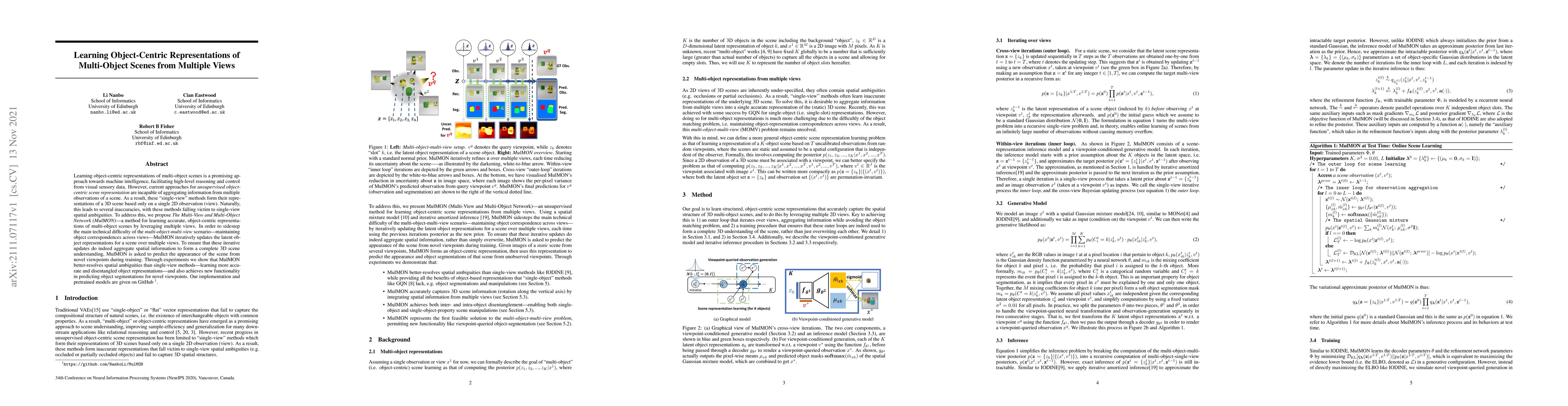 The paper proposes MulMON, a multi-view network for learning object-centric representations of multi-object scenes, addressing single-view spatial ambiguities by aggregating information from multiple observations. MulMON iteratively updates object representations and predicts scene appearance from novel viewpoints, achieving more accurate and disentangled representations.