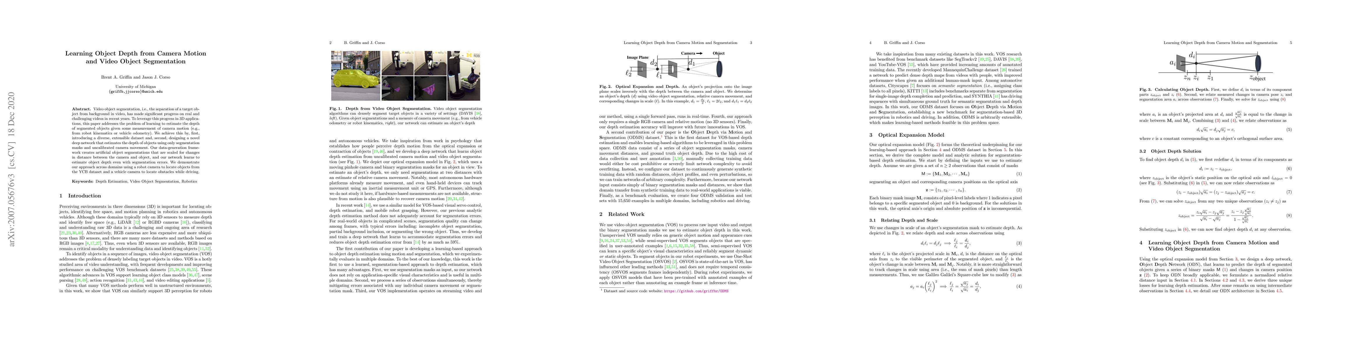 This paper introduces a new dataset and deep network to estimate object depth from camera motion and video segmentation, achieving depth estimation using only segmentation masks and uncalibrated camera movement. The method is demonstrated in applications like robot object localization and vehicle obstacle detection.