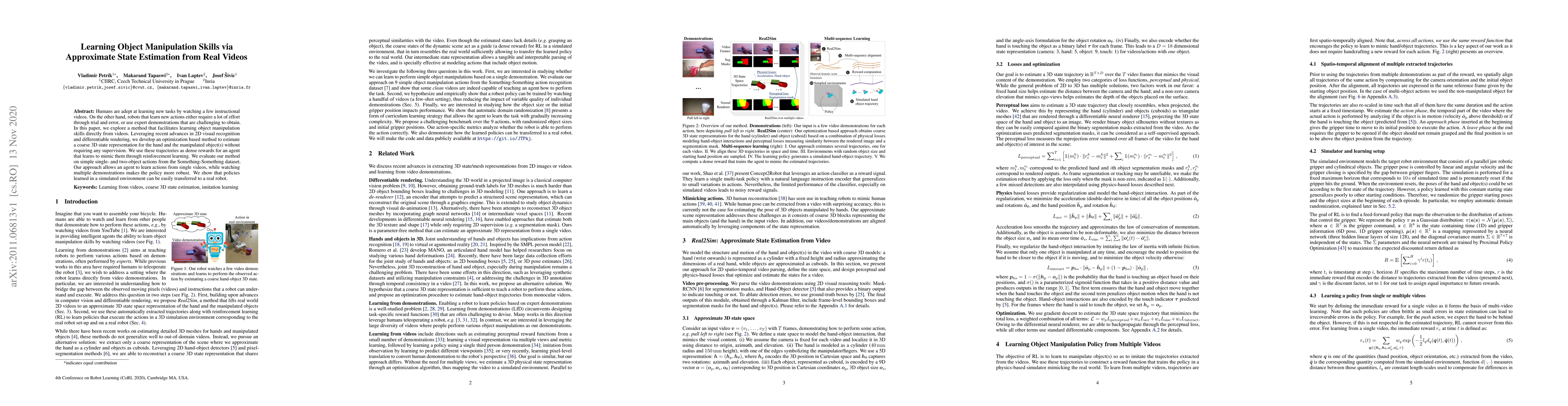 Humans are adept at learning new tasks by watching a few instructional videos. On the other hand, robots that learn new actions either require a lot of effort through trial and error, or use expert demonstrations that are challenging to obtain. In this paper, we explore a method that facilitates learning object manipulation skills directly from videos. Leveraging recent advances in 2D visual recognition and differentiable rendering, we develop an optimization based method to estimate a coarse 3D state representation for the hand and the manipulated object(s) without requiring any supervision. We use these trajectories as dense rewards for an agent that learns to mimic them through reinforcement learning. We evaluate our method on simple single- and two-object actions from the Something-Something dataset. Our approach allows an agent to learn actions from single videos, while watching multiple demonstrations makes the policy more robust. We show that policies learned in a simulated environment can be easily transferred to a real robot.