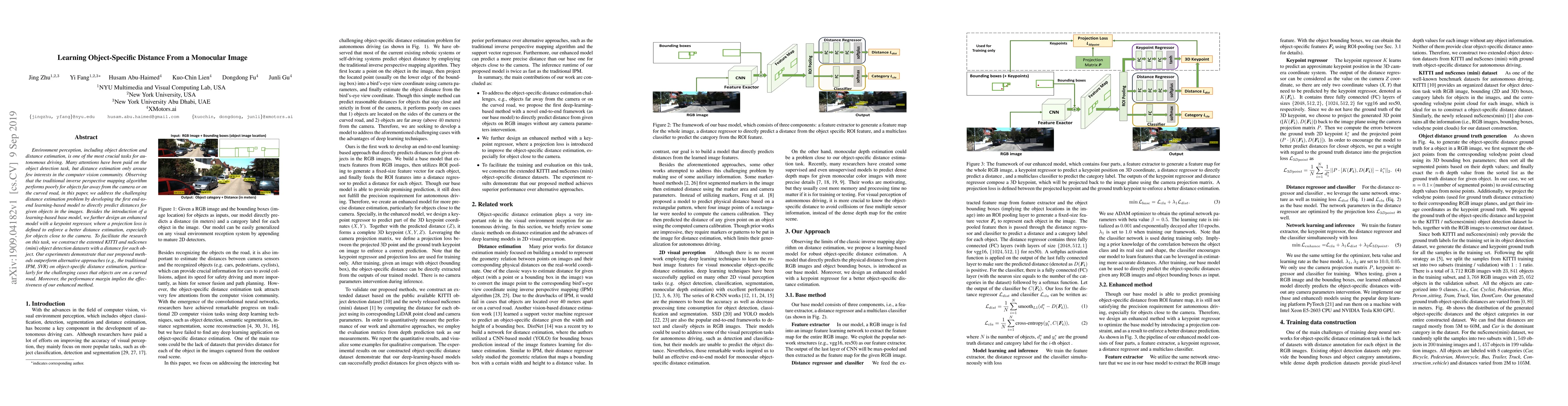 Environment perception, including object detection and distance estimation, is one of the most crucial tasks for autonomous driving. Many attentions have been paid on the object detection task, but distance estimation only arouse few interests in the computer vision community. Observing that the traditional inverse perspective mapping algorithm performs poorly for objects far away from the camera or on the curved road, in this paper, we address the challenging distance estimation problem by developing the first end-to-end learning-based model to directly predict distances for given objects in the images. Besides the introduction of a learning-based base model, we further design an enhanced model with a keypoint regressor, where a projection loss is defined to enforce a better distance estimation, especially for objects close to the camera. To facilitate the research on this task, we construct the extented KITTI and nuScenes (mini) object detection datasets with a distance for each object. Our experiments demonstrate that our proposed methods outperform alternative approaches (e.g., the traditional IPM, SVR) on object-specific distance estimation, particularly for the challenging cases that objects are on a curved road. Moreover, the performance margin implies the effectiveness of our enhanced method.