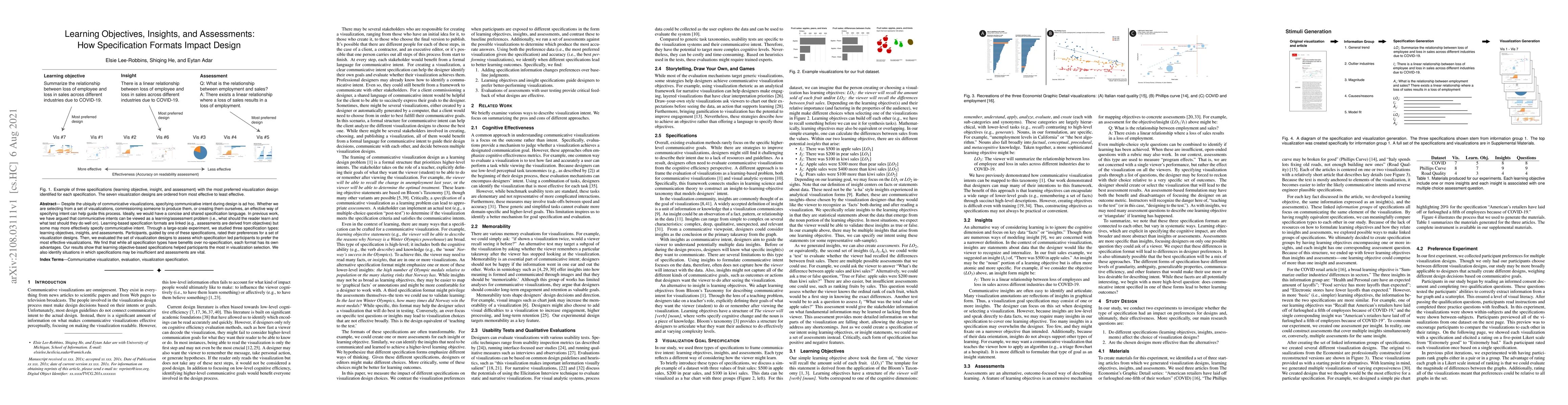This paper investigates how different specification formats—learning objectives, insights, and assessments—impact the design of visualizations. The study found that while all formats are beneficial, learning objective-based specifications were most effective in guiding participants to prefer the most effective visualizations.