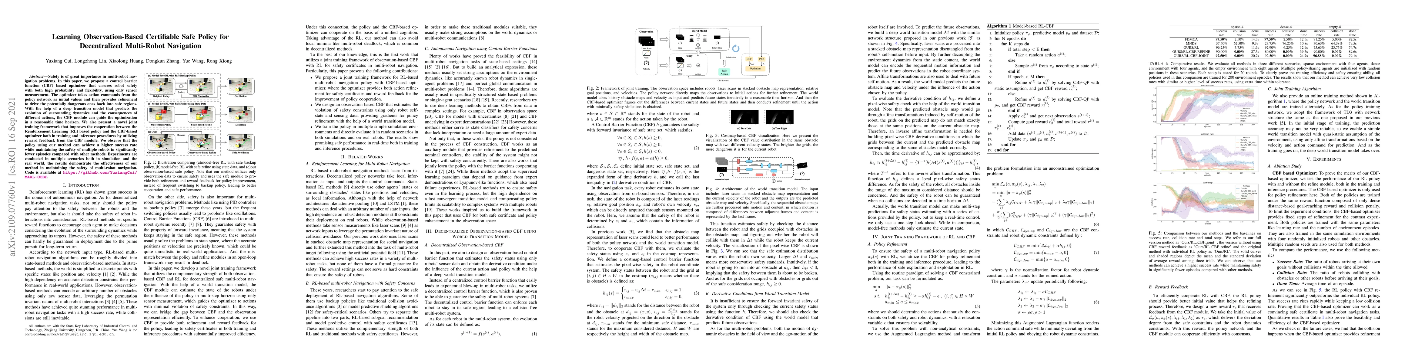 Safety is of great importance in multi-robot navigation problems. In this paper, we propose a control barrier function (CBF) based optimizer that ensures robot safety with both high probability and flexibility, using only sensor measurement. The optimizer takes action commands from the policy network as initial values and then provides refinement to drive the potentially dangerous ones back into safe regions. With the help of a deep transition model that predicts the evolution of surrounding dynamics and the consequences of different actions, the CBF module can guide the optimization in a reasonable time horizon. We also present a novel joint training framework that improves the cooperation between the Reinforcement Learning (RL) based policy and the CBF-based optimizer both in training and inference procedures by utilizing reward feedback from the CBF module. We observe that the policy using our method can achieve a higher success rate while maintaining the safety of multiple robots in significantly fewer episodes compared with other methods. Experiments are conducted in multiple scenarios both in simulation and the real world, the results demonstrate the effectiveness of our method in maintaining the safety of multi-robot navigation. Code is available at \url{https://github.com/YuxiangCui/MARL-OCBF