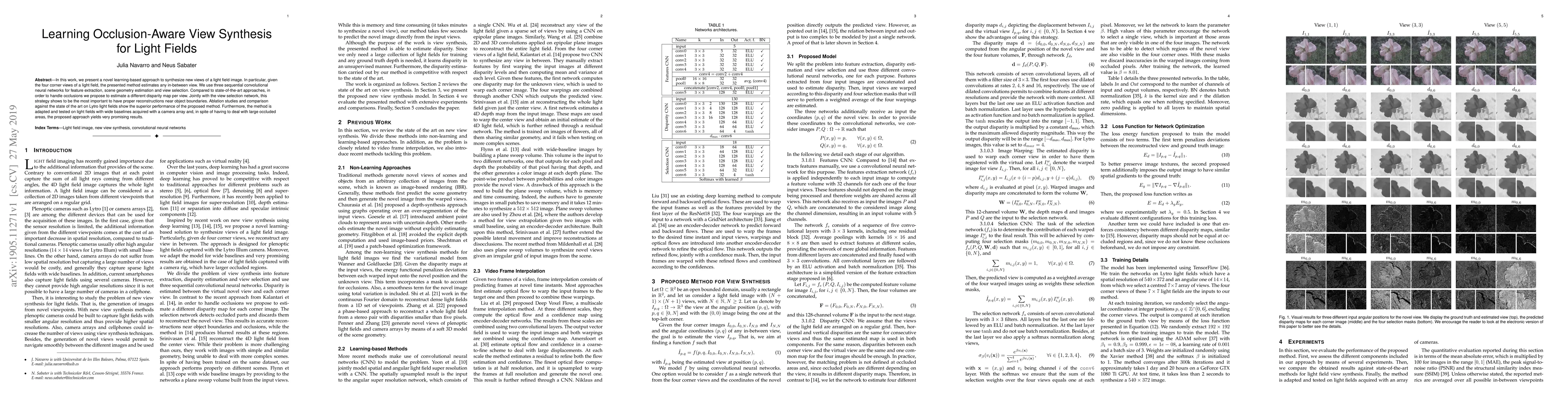 In this work, we present a novel learning-based approach to synthesize new views of a light field image. In particular, given the four corner views of a light field, the presented method estimates any in-between view. We use three sequential convolutional neural networks for feature extraction, scene geometry estimation and view selection. Compared to state-of-the-art approaches, in order to handle occlusions we propose to estimate a different disparity map per view. Jointly with the view selection network, this strategy shows to be the most important to have proper reconstructions near object boundaries. Ablation studies and comparison against the state of the art on Lytro light fields show the superior performance of the proposed method. Furthermore, the method is adapted and tested on light fields with wide baselines acquired with a camera array and, in spite of having to deal with large occluded areas, the proposed approach yields very promising results.