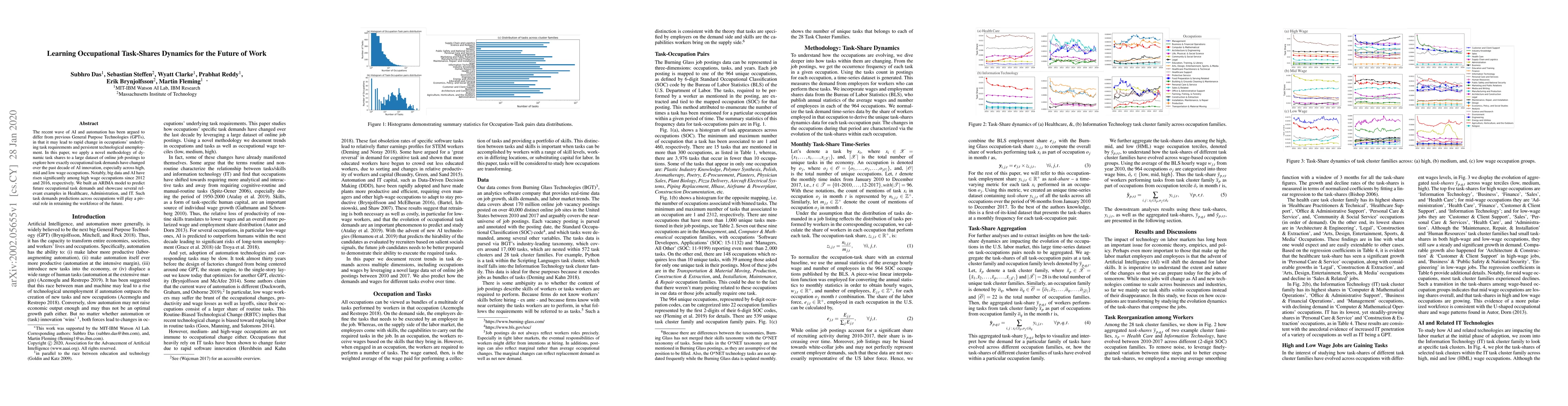 The recent wave of AI and automation has been argued to differ from previous General Purpose Technologies (GPTs), in that it may lead to rapid change in occupations' underlying task requirements and persistent technological unemployment. In this paper, we apply a novel methodology of dynamic task shares to a large dataset of online job postings to explore how exactly occupational task demands have changed over the past decade of AI innovation, especially across high, mid and low wage occupations. Notably, big data and AI have risen significantly among high wage occupations since 2012 and 2016, respectively. We built an ARIMA model to predict future occupational task demands and showcase several relevant examples in Healthcare, Administration, and IT. Such task demands predictions across occupations will play a pivotal role in retraining the workforce of the future.