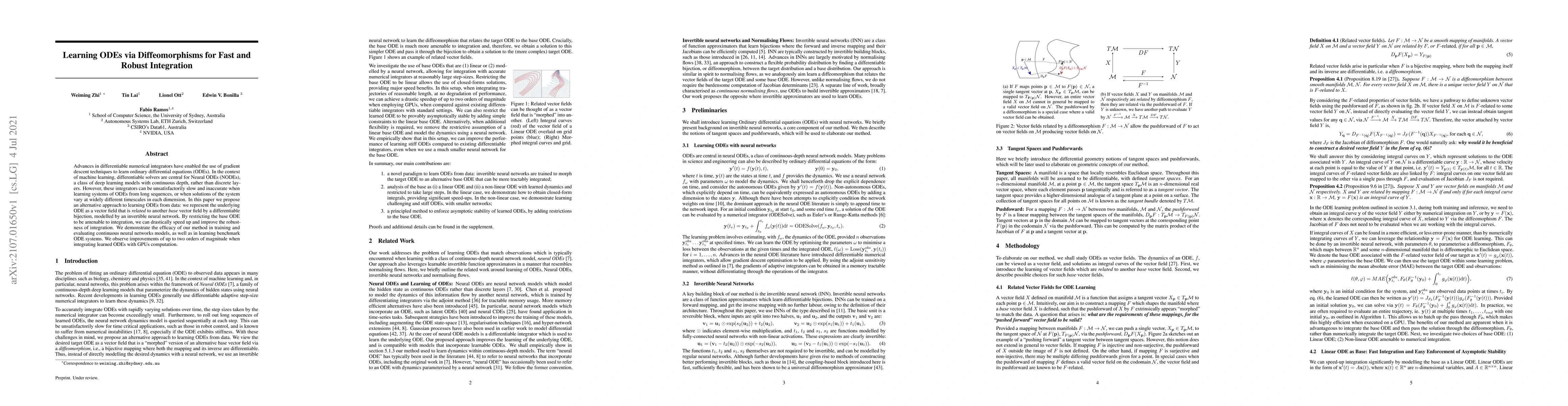 This paper proposes a novel method for learning ordinary differential equations (ODEs) using diffeomorphisms to relate the learned ODE to a base ODE that is easier to integrate, significantly speeding up and improving the accuracy of integration. The approach demonstrates substantial improvements in training continuous neural networks and learning benchmark ODE systems.
