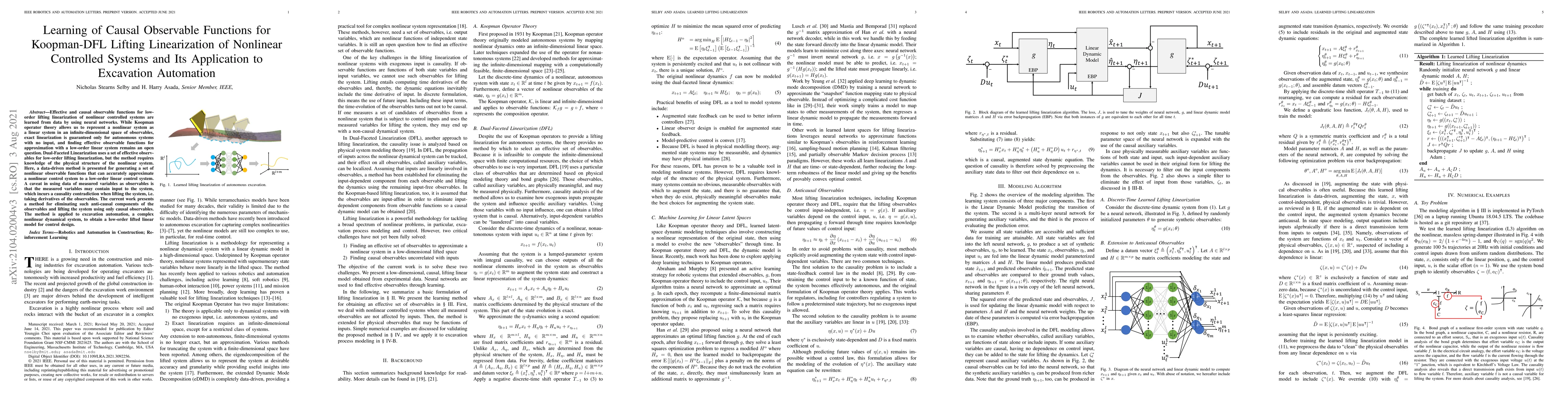 This paper presents a data-driven method using neural networks to learn causal observable functions for low-order lifting linearization of nonlinear controlled systems, addressing the challenge of approximating such systems without prior knowledge of their physical structure. The method eliminates anti-causal components to ensure accurate modeling, demonstrated through its application in excavation automation.